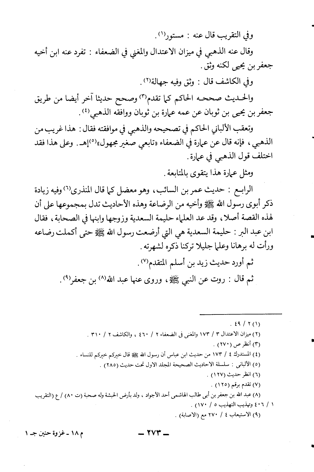 الرابع: حديث عمر بن السائب، وهومعضل كما قال المنذري6 وفيه زيادة ذكر أبوي رسول الله صلى الله عليه وسلم وأخيه من الرضاعة وهذه الأحاديث تدل بمجموعها على أن لهذه القصة أصلا، وقد عد العلماء حليمة السعدية وزوجها وابنها في الصحابة، فقال ابن عبد البر: حليمة السعدية هي التي أرضعت رسول الله صلى الله عليه وسلم حتى أكملت رضاعه ورأت له برهانا وعلماً جليلاً تركنا ذكره لشهرته.