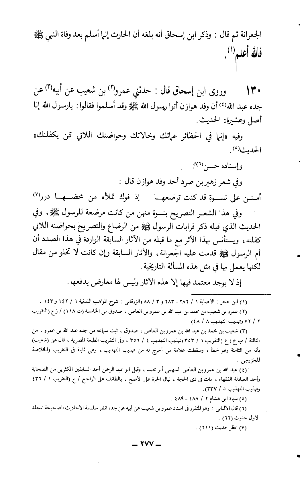 130- وروى ابن إسحاق قال: حدثني عمرو2 بن شعيب عن أبيه 3 عن جده عبد الله4 أن وفد هوازن أتوا رسول الله صلى الله عليه وسلم وقد أسلموا فقالوا: يا رسول الله إنا أصل وعشيرة" الحديث.