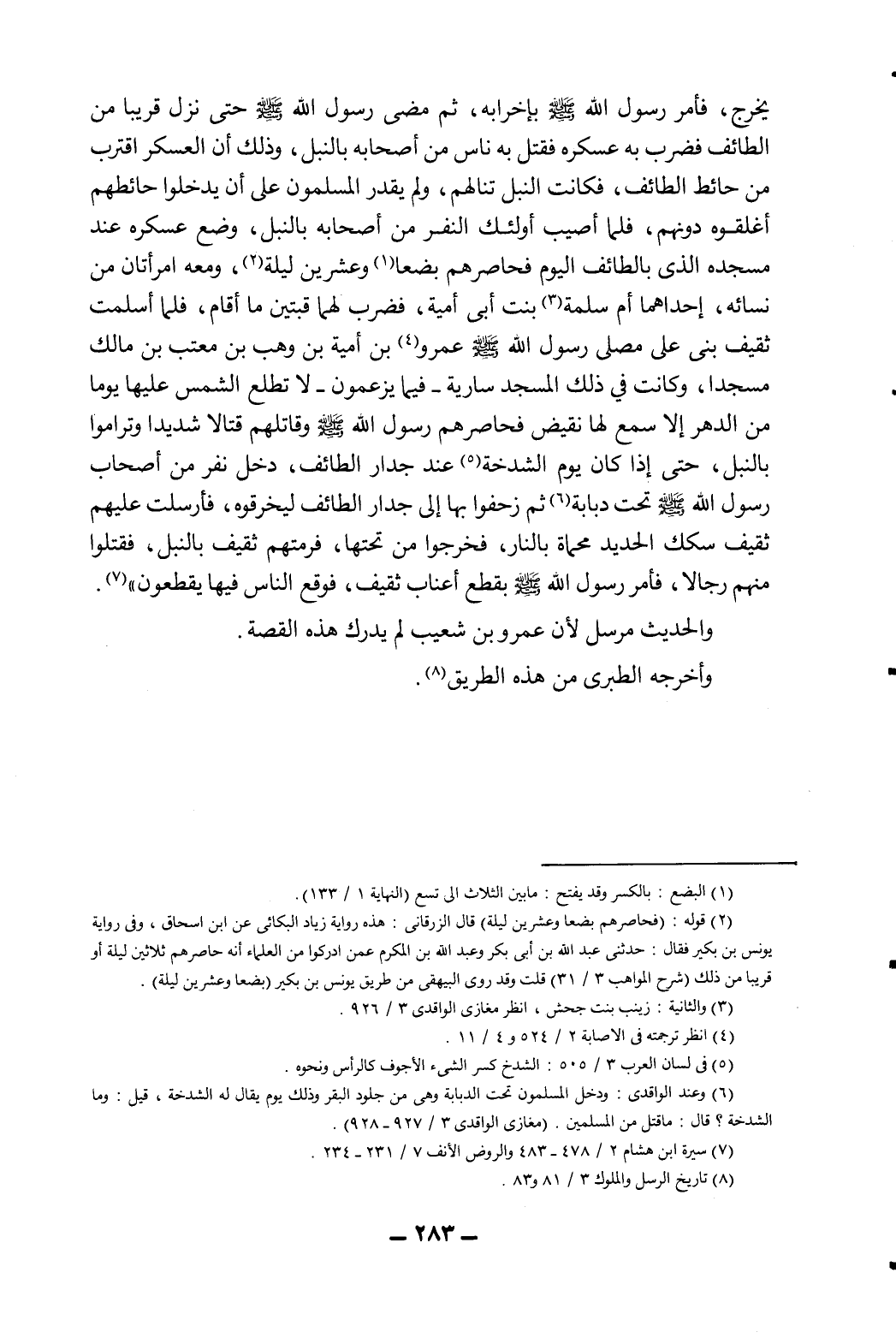 يخرج، فأمر رسول الله صلى الله عليه وسلم بإخراجه، ثم مضى رسول الله صلى الله عليه وسلم حتى نزل قريبا من الطائف فضرب به عسكره فقتل به ناس من أصحابه بالنبل، وذلك أن العسكر اقترب من حائط الطائف، فكانت النبل تنالهم، ولم يقدر المسلمون على أن يدخلوا حائطهم أغلقوه دونهم، فلما أصيب أولئك النفر من أصحابه بالنبل، وضع عسكره عند مسجده الذي بالطائف اليوم فحاصرهم بضعا1 وعشرين ليلة2، ومعه امرأتان من نسائه، إحداهما أم سلمة3 بنت أبي أمية، فضرب لهما قبتين، ما أقام، فلما أسلمت ثقيف بنى على مصلى رسول الله صلى الله عليه وسلم عمرو4 بن أمية بن وهب بن معتب بن مالك مسجدا، وكانت في ذلك المسجد سارية - فيما يزعمون - لا تطلع الشمس عليها يوما من الدهر إلا سمع لها نقيض فحاصرهم رسول الله صلى الله عليه وسلم وقاتلهم قتالا شديدا وتراموا بالنبل، حتى إذا كان يوم الشدخة5 عند جدار الطائف، دخل نفر من أصحاب رسول الله صلى الله عليه وسلم تحت الدبابة ثم زحفوا بها إلى جدار الطائف6 ليخرقوه، فأرسلت عليهم ثقيف سكك الحديد محماة بالنار، فخرجوا من تحتها، فرمتهم ثقيف بالنبل، فقتلوا منهم رجالا، فأمر رسول الله صلى الله عليه وسلم بقطع أعناب ثقيف، فوقع الناس فيها يقطعون"7.