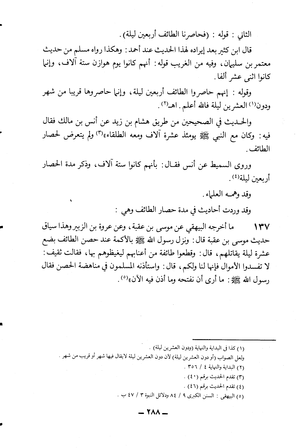 138- ما أخرجه البيهقي عن موسى بن عقبة، وعن عروة بن الزبير وهذا سياق حديث موسى بن عقبة قال: ونزل رسول الله صلى الله عليه وسلم بالأكمة عند حصن الطائف بضع عشرة ليلة يقاتلهم، قال: وقطعوا طائفة من أعنابهم ليغيظوهم بها، فقالت ثقيف: لا تفسدوا الأموال فإنها لنا ولكم، قال: واستأذنه المسلمون في مناهضة الحصن فقال: رسول الله صلى الله عليه وسلم: "ما أرى أنّ نفحته وما أذن فيه الآن" 5.