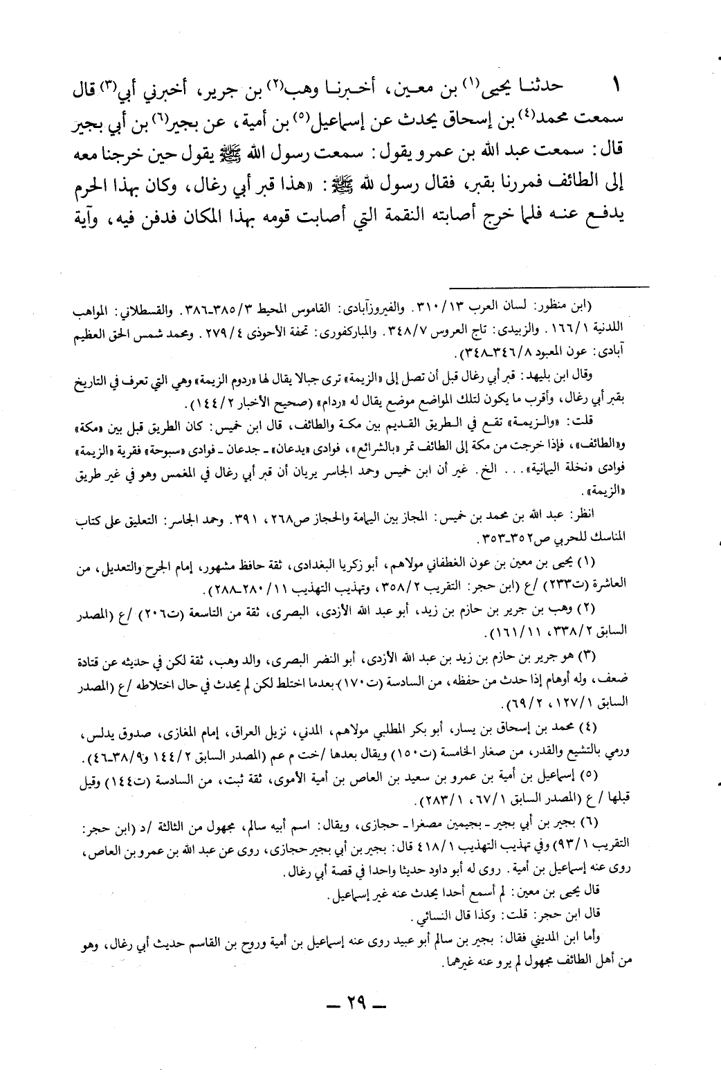 1- حدثنا يحيى1بن معين، أخبرنا وهب2 بن جرير، أخبرني أبي3 قال سمعت محمد4 بن إسحاق يحدث عن إسماعيل5 بن أمية، عن بجير6 بن أبي بجير قال: سمعت عبد الله بن عمرو يقول: سمعت رسول الله - صلى الله عليه وسلم - يقول حين خرجنا معه إلى الطائف فمررنا بقبر، فقال رسول الله - صلى الله عليه وسلم -: "هذا قبر أبي رغال، وكان بهذا الحرم يدفع عنه فلما خرج أصابته النقمة التي أصابت قومه بهذا المكان فدفن فيه، وآية