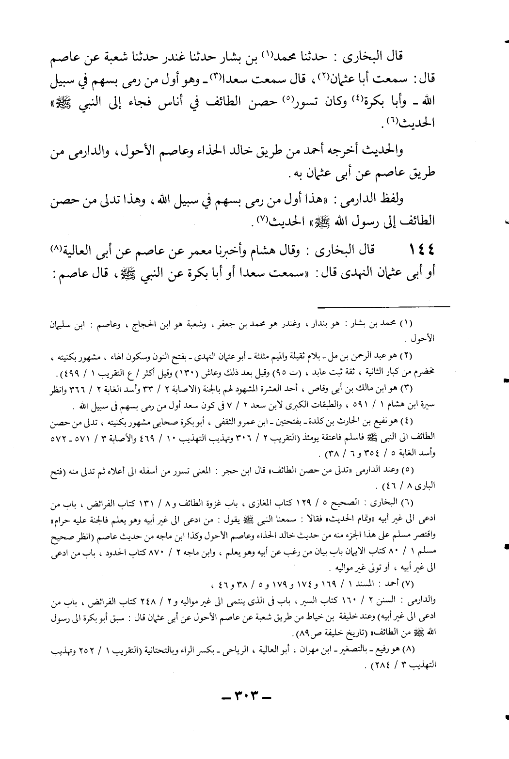 144- قال البخاري: وقال هشام وأخبرنا معمر عن عاصم عن أبي العالية8 أو أبي عثمان النهدي قال: "سمعت سعدا أو أبا بكرة عن النبي صلى الله عليه وسلم"، قال عاصم:
