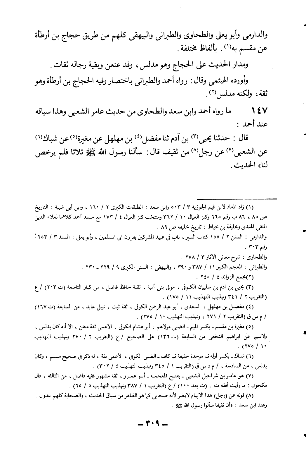 147- ما رواه أحمد وابن سعد والطحاوي من حديث عامر الشعبي وهذا سياقه عند أحمد: