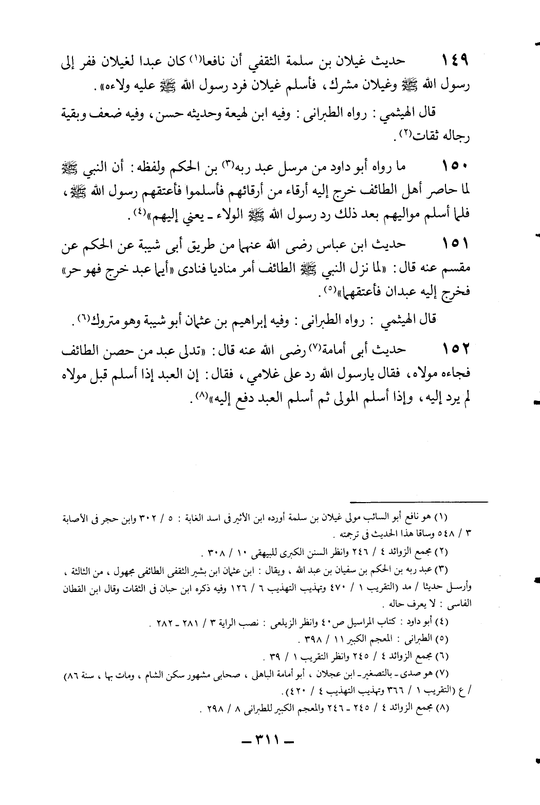 152- حديث أبي أمامة7 - رضي الله عنه - قال: "تدلى عبد من حصن الطائف فجاءه مولاه، فقال يا رسول الله رد علي غلامي، فقال: إن العبد إذا أسلم قبل مولاه لم يرد إليه، وإذا أسلم المولى ثم أسلم العبد دفع إليه" 8.