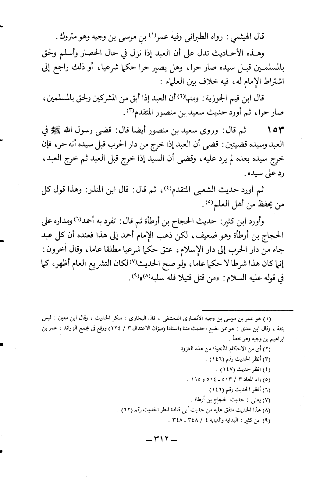 153- ثم قال: وروى سعيد بن منصور أيضا قال: "قضى رسول الله صلى الله عليه وسلم في العبد وسيده قضيتين، قضى أن العبد إذا خرج من دار الحرب قبل سيده أنه حر، فإن خرج سيده بعده لم يرد عليه، وقضى أن السيد إذا خرج قبل العبد ثم خرج العبد، رد على سيده.