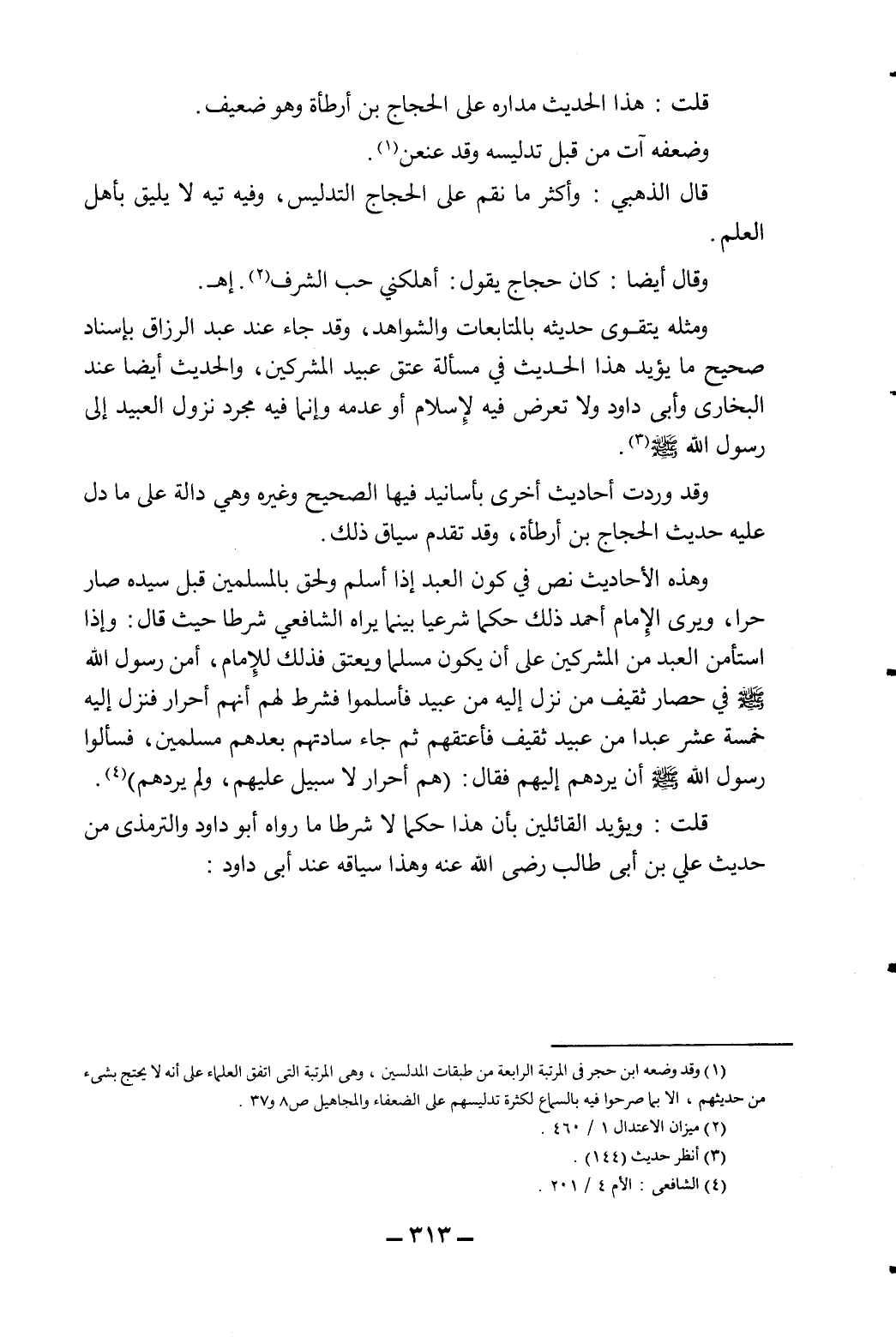 ومثله يتقوى حديثه بالمتابعات والشواهد، وقد جاء عند عبد الرزاق بإسناد صحيح ما يؤيد هذا الحديث في مسألة عتق عبيد المشركين، والحديث أيضاً عند البخاري وأبي داود ولا تعرض فيه لإسلام أو عدمه وإنما فيه مجرد نزول العبيد إلى رسول الله صلى الله عليه وسلم 3.