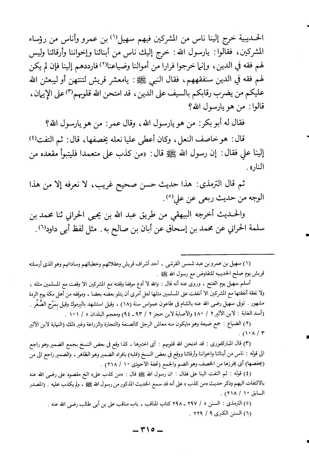 فقال له أبو بكر: "من هو يا رسول الله، وقال عمر: من هو يا رسول الله؟ قال: "هو خاصف النعل، وكان أعطى عليا نعله يخصفها، قال: ثم التفت4 إلينا علي فقال: إن رسول الله صلى الله عليه وسلم قال: "من كذب علي متعمدا فليتبوأ مقعده من النار".