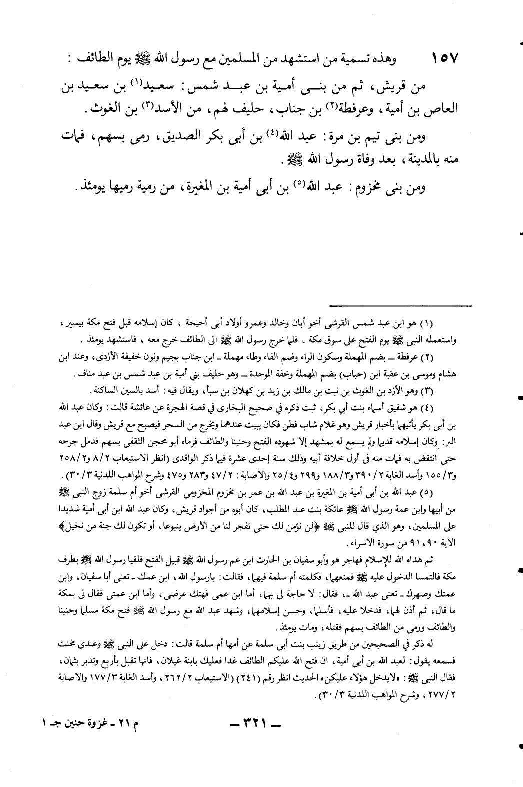 157- وهذه تسمية من استشهد من المسلمين مع رسول الله صلى الله عليه وسلم يوم الطائف: من قريش، ثم من بني أمية بن عبد شمس: سعيد1 بن سعيد بن العاص بن أمية وعرفطة2بن جناب، حليف لهم، من الأسد3بن الغوث.