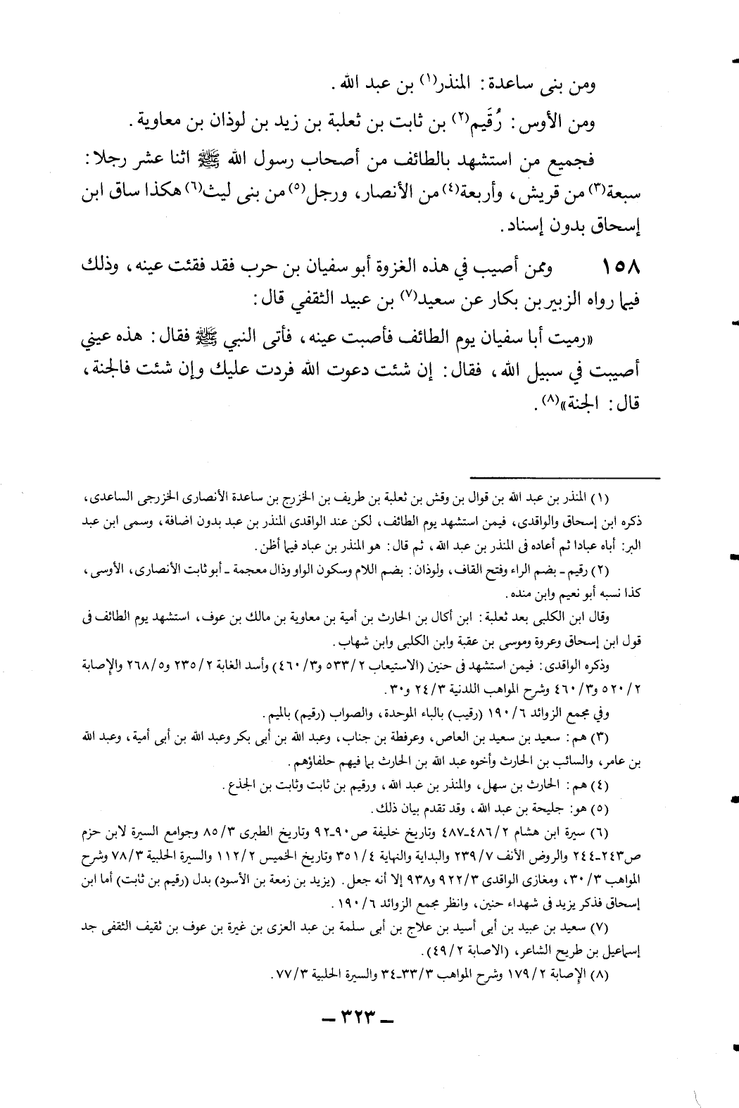 158- وممن أصيب في هذه الغزوة أبو سفيان بن حرب فقد فقئت عينه، وذلك فيما رواه ابن الزبير بن بكار عن سعيد7 بن عبيد الثقفي قال: "رميت أبا سفيان يوم الطائف فأصبت عينه، فأتى النبي صلى الله عليه وسلم فقال: هذه عيني أصيبت في سبيل الله، فقال: "إن شئت دعوت الله فردت عليك وإن شئت فالجنة، فقال: الجنة" 8.
