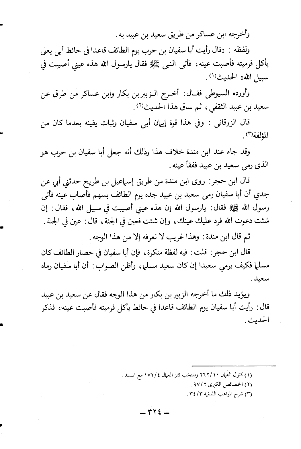 قال ابن حجر: "قلت: فيه لفظة منكرة، فإن أبا سفيان في حصار الطائف كان مسلما فكيف يرمي سعيدا إن كان سعيدا مسلما، وأظن الصواب: أن أبا سفيان رماه سعيد".