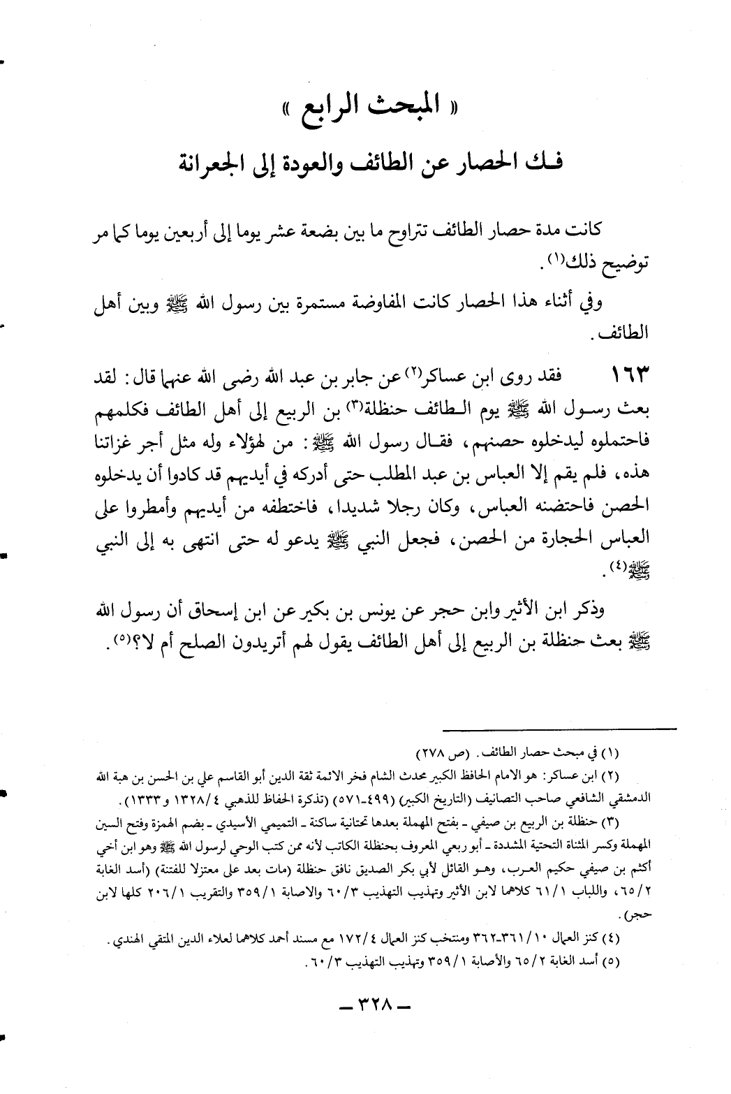 163- فقد روى ابن عساكر2 عن جابر بن عبد الله - رضي الله عنهما - قال: لقد بعث رسول الله صلى الله عليه وسلم يوم الطائف حنظلة3 بن الربيع إلى أهل الطائف فكلمهم فاحتملوه ليدخلوه حصنهم، فقال رسول الله صلى الله عليه وسلم: "من لهؤلاء وله مثل أجر غزاتنا هذه"، فلم يقم إلا العباس بن عبد المطلب حتى أدركه في أيديهم قد كادوا أن يدخلوه الحصن فاحتضنه العباس، وكان رجلاً شديداً، فاختطفه من أيديهم وأمطروا على العباس الحجارة من الحصن، فجعل النبي صلى الله عليه وسلم يدعو له حتى انتهى به إلى النبي صلى الله عليه وسلم 4.