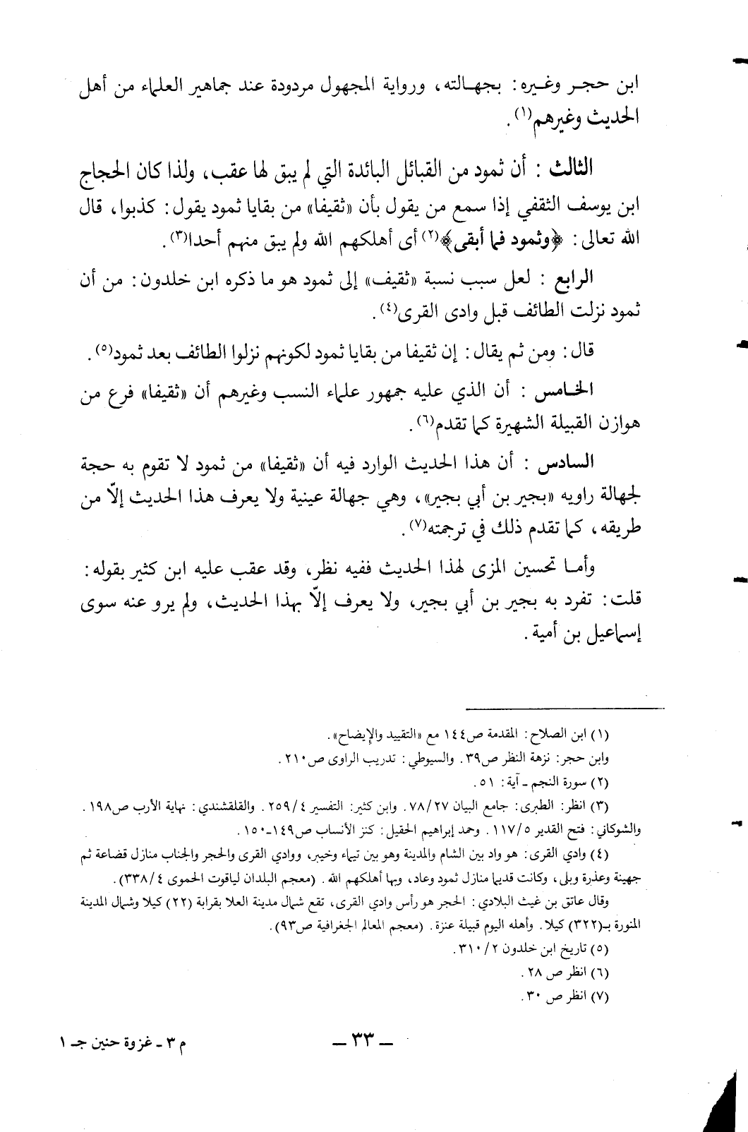 السادس: أن هذا الحديث الوارد فيه أن "ثقيفاً" من ثمود لا تقوم به حجة لجهالة راويه "بجير بن أبي بجير"، وهي جهالة عينية ولا يعرف هذا الحديث إلاّ من طريقه، كما تقدم ذلك في ترجمته6.