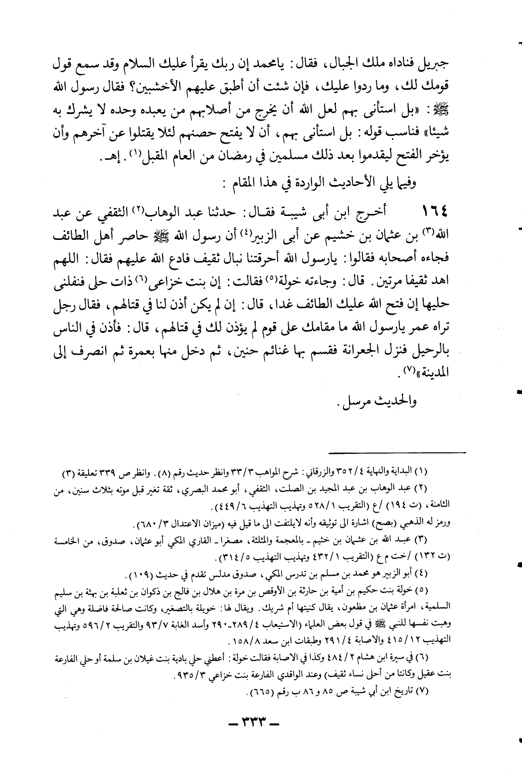 164- أخرج ابن أبي شيبة فقال: حدثنا عبد الوهاب2 الثقفي عن عبد الله3 بن عثمان بن خشيم عن أبي الزبير4 أن رسول الله صلى الله عليه وسلم حاصر أهل الطائف فجاءه أصحابه فقالوا: يا رسول الله أحرقتنا نبال ثقيف فادع الله عليهم فقال: اللهم اهد ثقيفاً مرتين. قال: وجاءته خولة5 فقالت: إن بنت خزاعى6 ذات حلي فنفلني حليها إن فتح الله عليك الطائف غدا، قال: إن لم يكن أذن لنا في قتالهم، فقال رجل تراه عمر يا رسول الله ما مقامك على قوم لم يؤذن لك في قتالهم، قال: "فأذن في الناس بالرحيل فنزل الجعرانة فقسم بها غنائم حنين، ثم دخل منها بعمرة ثم انصرف إلى المدينة" 7.