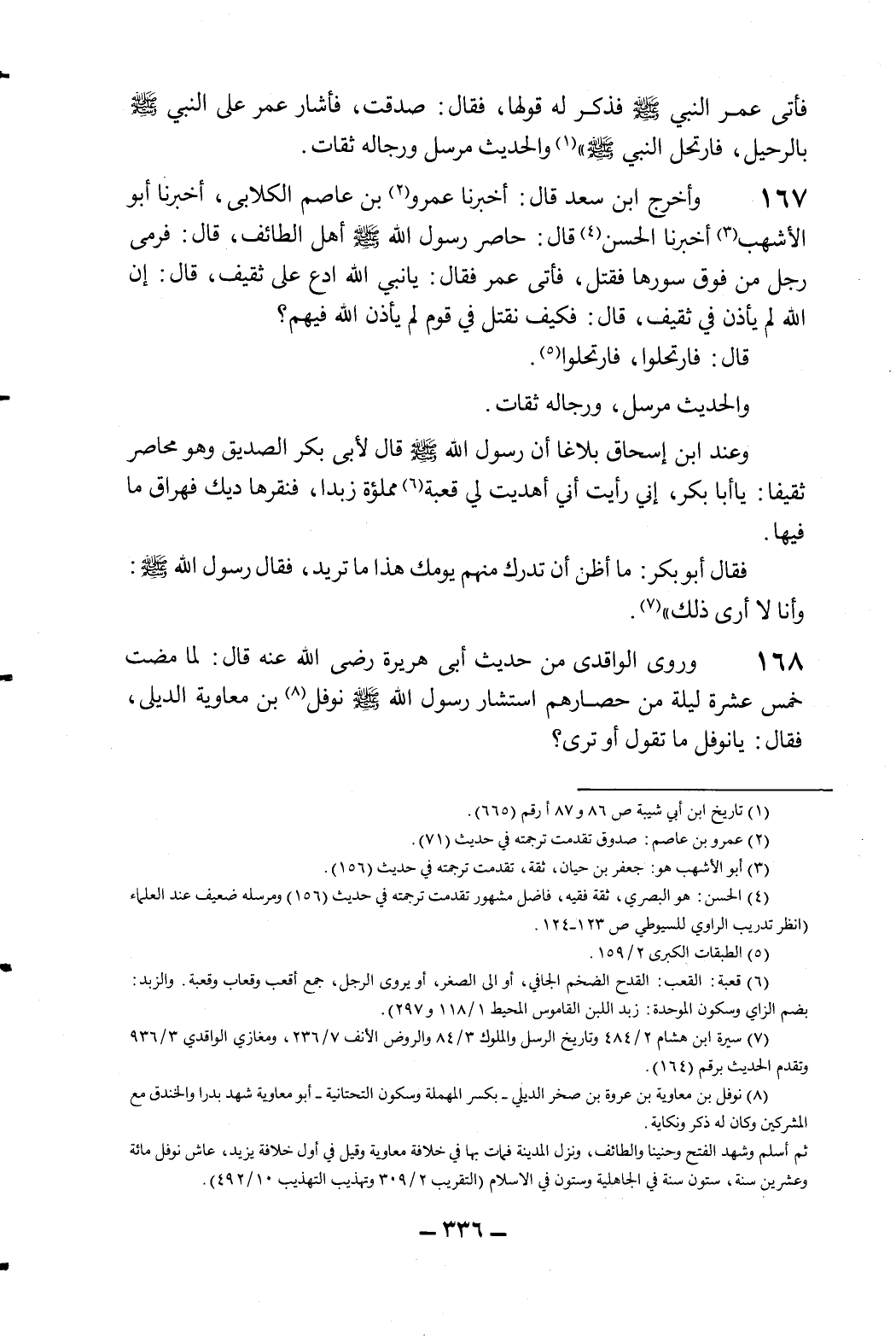 167- وأخرج ابن سعد قال: أخبرنا عمرو2 بن عاصم الكلابي، أخبرنا أبو الأشهب3 أخبرنا الحسن4 قال: حاصر رسول الله صلى الله عليه وسلم أهل الطائف، قال: فرمى رجل من فوق سورها فقتل، فأتى عمر فقال: "يا نبي الله ادع على ثقيف، قال: إن الله لم يأذن في ثقيف، قال: فكيف نقتل في قوم لم يأذن الله فيهم؟ قال: فارتحلوا، فارتحلوا5.