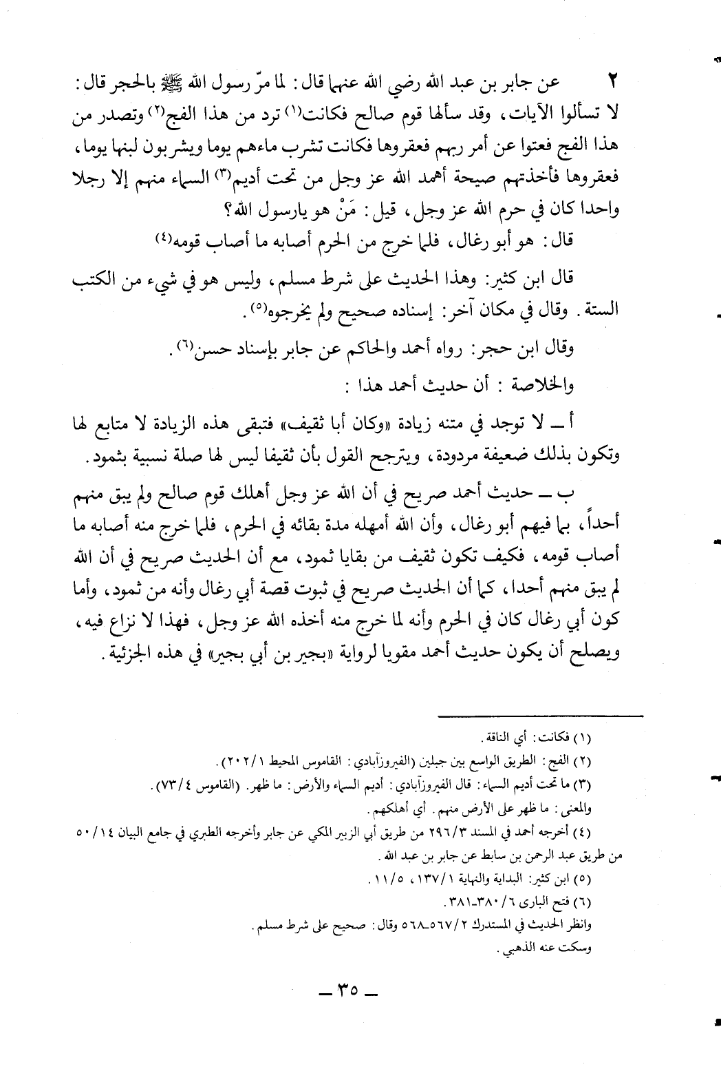 أ – لا توجد في متنه زيادة "وكان أبا ثقيف" فتبقى هذه الزيادة لا متابع لها وتكون بذلك ضعيفة مردودة، ويترجح القول بأن ثقيفاً ليس لها صلة نسبية بثمود.