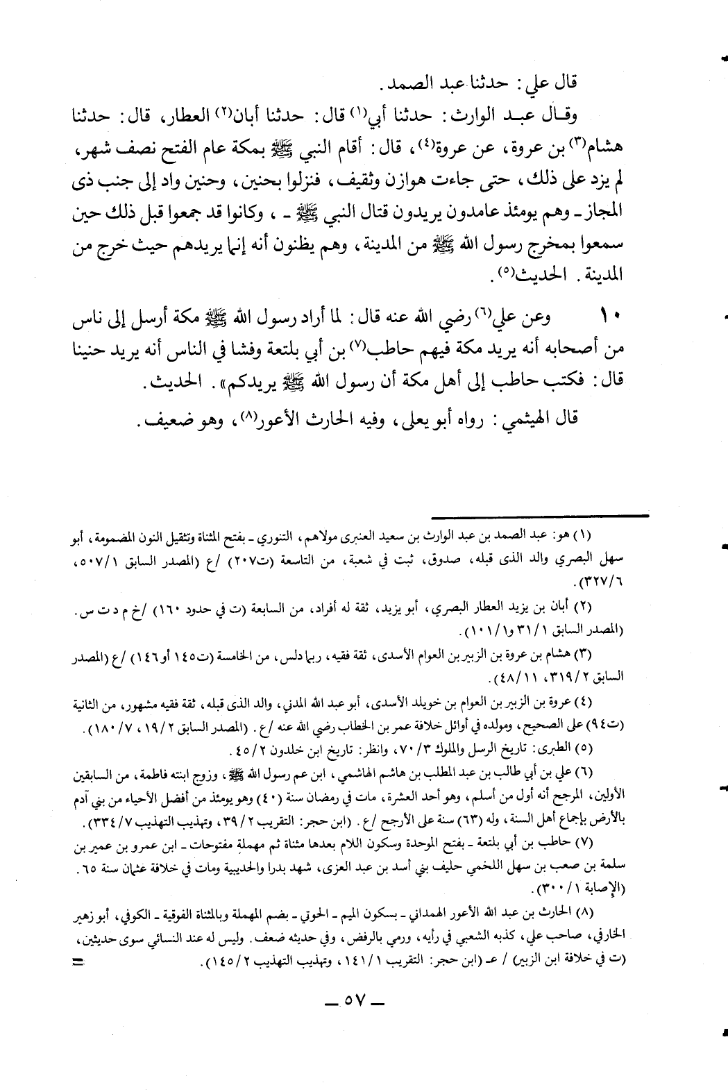 10- وعن عليّ6 - رضي الله عنه - قال: "لما أراد رسول الله - صلى الله عليه وسلم - مكة أرسل إلى ناس من أصحابه أنه يريد مكة وفيهم حاطب7 بن أبي بلتعة وفشا في الناس أنه يريد حنينا. قال: فكتب حاطب إلى أهل مكة أن رسول الله - صلى الله عليه وسلم - يريدكم. الحديث.