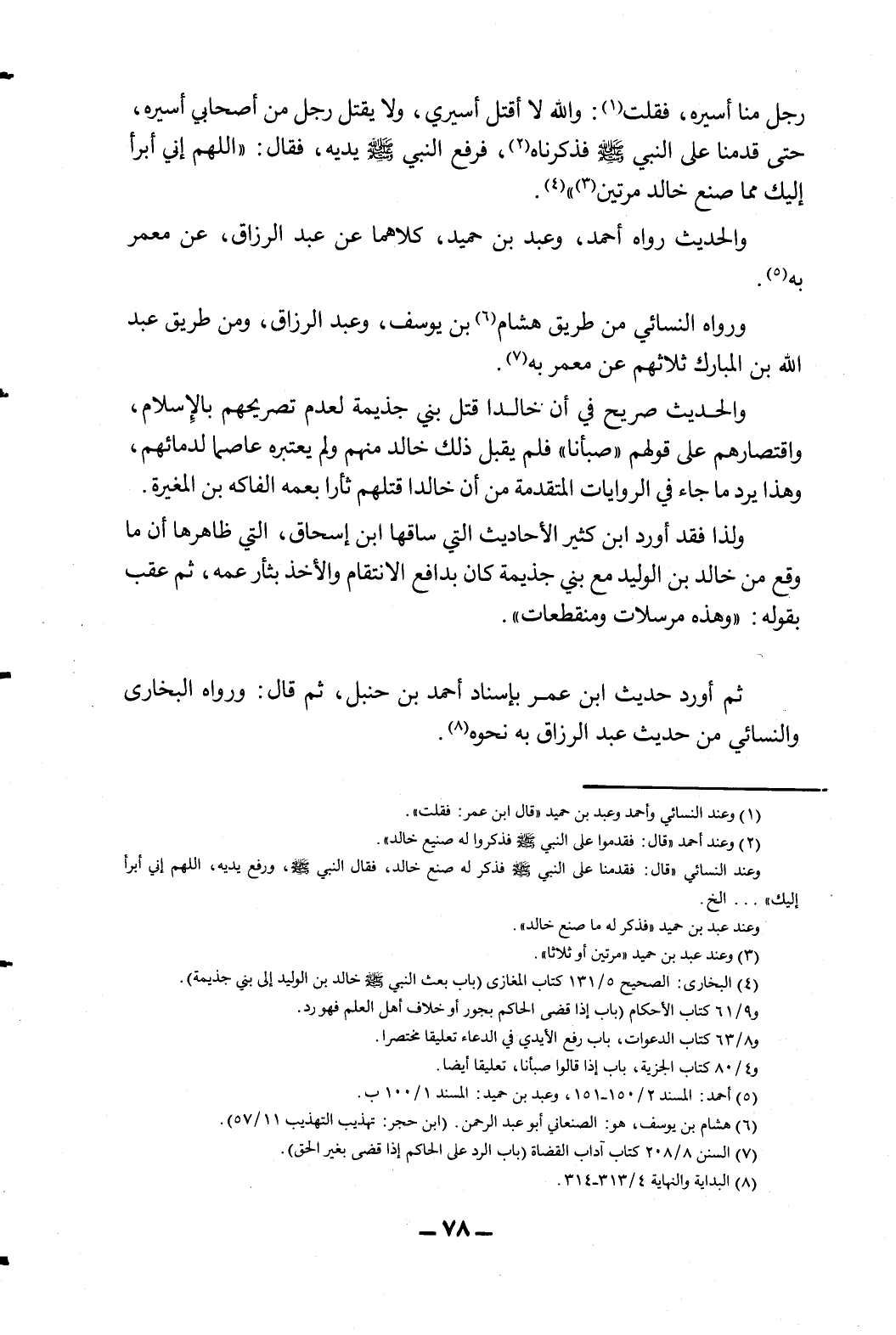 4 البخاري: (الصحيح 5/131 كتاب المغازي (باب بعث النبي - صلى الله عليه وسلم - خالد بن وليد إلى بني جذيمة) . و9/1 كتاب الأحكام، باب إذا قضى الحاكم بجور أو خلاف أهل العلم فهو رد. و8/63 كتاب الدعوات، باب رفع الأيدي في الدعاء تعليقا مختصرا. و4/80 كتاب الجزية، باب إذا قالوا صبأنا، تعليقا أيضا.