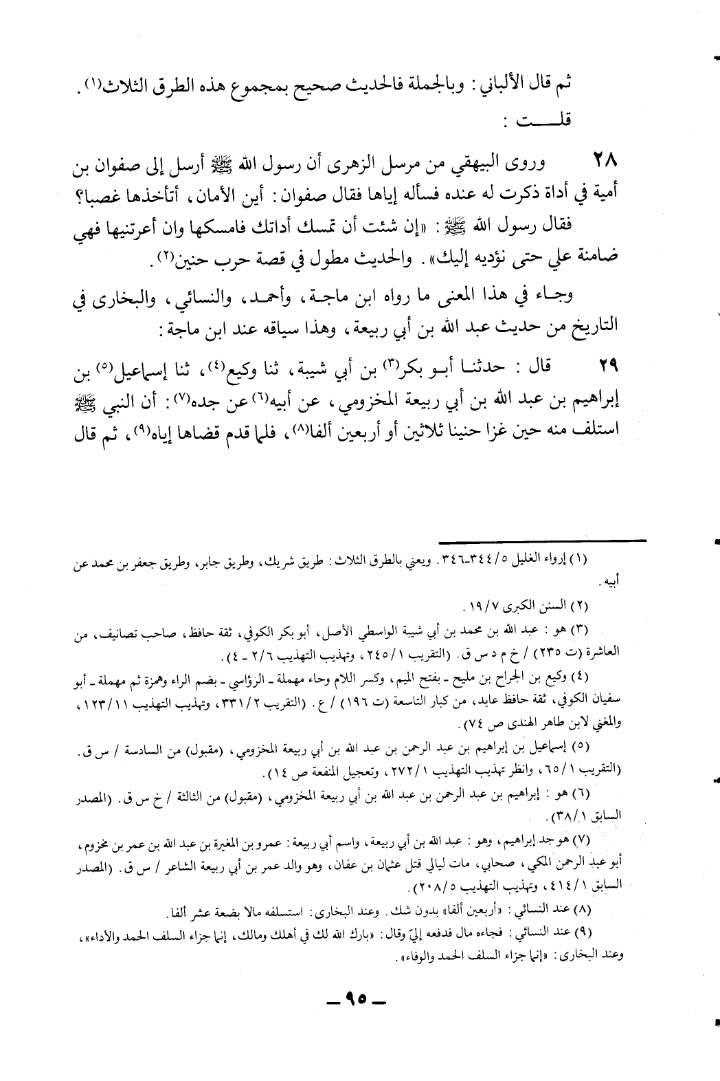28- وروى البيهقي من مرسل الزهري أن رسول الله - صلى الله عليه وسلم - أرسل إلى صفوان بن أمية في أداة ذكرت له عنده فسأله إياها فقال صفوان: أين الأمان، أتأخذها غصبا؟ فقال رسول الله - صلى الله عليه وسلم -: "إن شئت أن تمسك أداتك فامسكها وإن أعرتنيها فهي ضامنة علي حتى نؤديه إليك". والحديث مطول في قصة حرب حنين2.