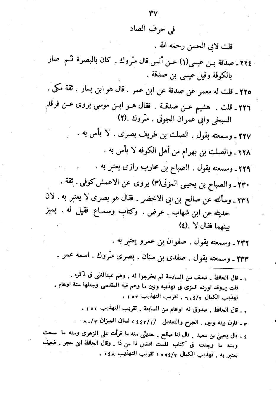 226- قلت: هشيم عن صدقة, فقال: هو ابن موسى يروي عن فرقد السبخي وأبي عمران الجوني متروك2.