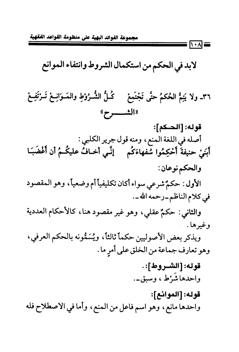 36- ولا يتم الحكمُ حتى تجتمعْ ... كلُّ الشروط والموانع تُرْتَفَعْ