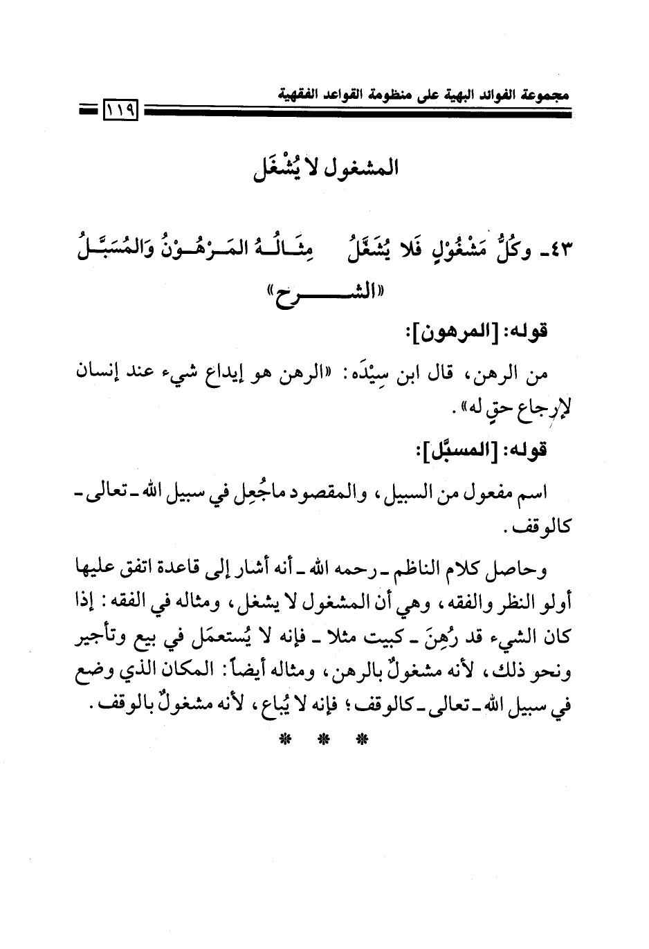 43- وكلُّ مشغولٍ فلا يُشَغَّلُ ... مثالُه المرهونُ والْمُسَبَّلُ