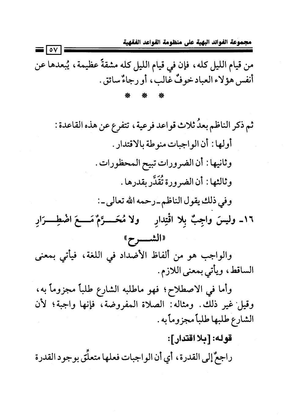 16- وليس واجبٌ بلا اقْتدار ... ولا مُحَرَّمٌ مع اضطرارِ