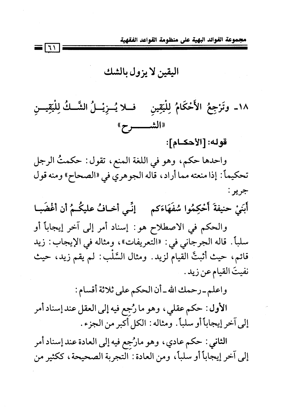 18- وتَرجِع الأحكامُ لليقينِ ... فلا يُزيلُ الشكُّ لليقينِ