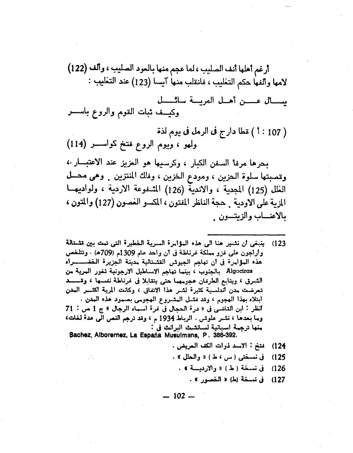 بحرها مرفأ السفن الكبار، وكرسيها هو العزيز عند الاعتبار، وقصبتها سلوة الحزين، ومودع الخزين، وفلك المنتزين. وهى محل الغلل «125» المجدية، والاندية «126» المشفوعة الاردية، ولواديها المزية على الاودية. حجة الناظر المفتون، المكسو الغصون «127» والمتون، بالاعناب والزيتون.