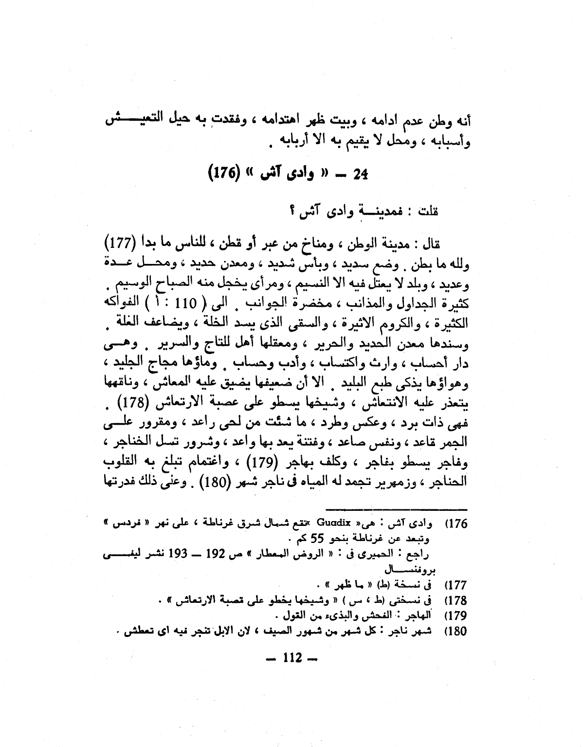 وسندها معدن الحديد والحرير، ومعقلها أهل للتاج والسرير. وهى دار أحساب، وارث واكتساب، وأدب وحساب. وماؤها مجاج الجليد، وهواؤها يذكى طبع البليد. الا أن ضعيفها يضيق عليه المعاش، وناقهها يتعذر عليه الانتعاش، وشيخها يسطو على عصبة الارتعاش «178» .