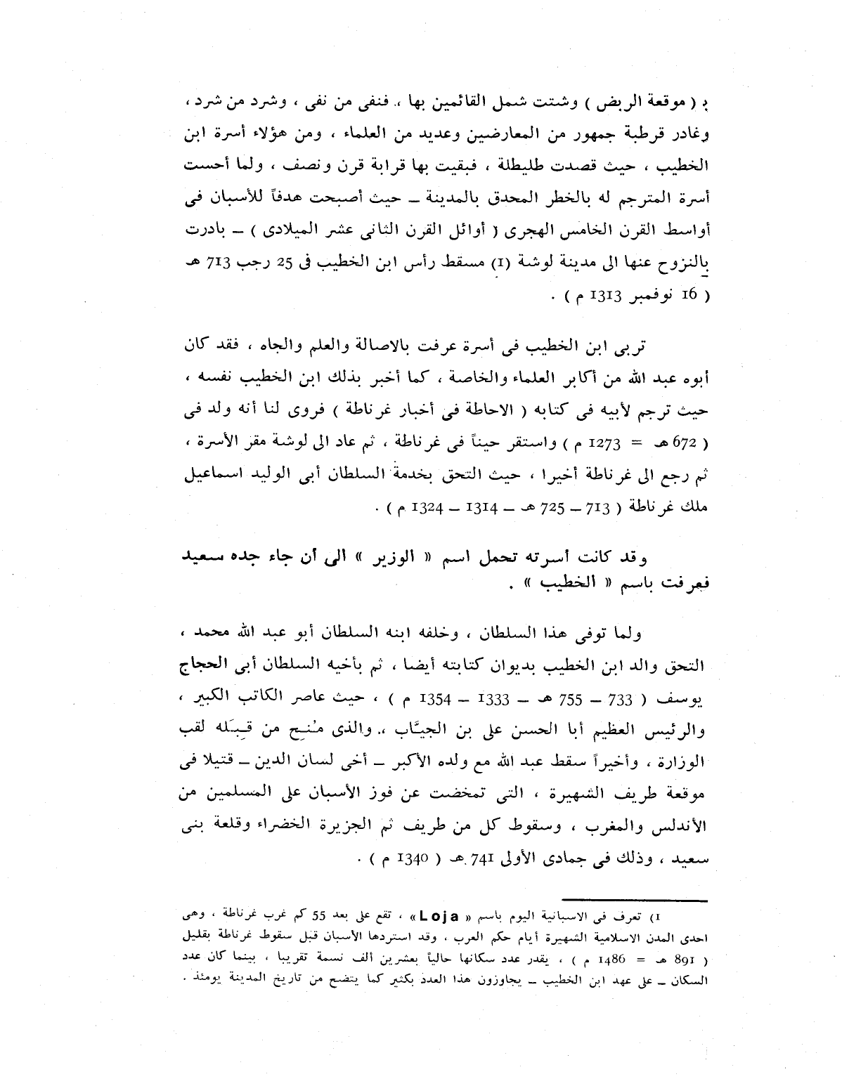 ب (موقعة الربض) وشنتت شمل القائمين بها، فنفى من نفى، وشرد من شرد، وغادر قرطبة جمهور من المعارضين وعديد من العلماء، ومن هؤلاء أسرة ابن الخطيب، حيث قصدت طليطلة، فبقيت بها قرابة قرن ونصف، ولما أحست أسرة المترجم له بالخطر المحدق بالمدينة- حيث أصبحت هدفا للأسبان فى أواسط القرن الخامس الهجرى (أوائل القرن الثانى عشر الميلادى) - بادرت بالنزوح عنها الى مدينة لوشة «1» مسقط رأس ابن الخطيب فى 25 رجب 713 هـ (16 نوفمبر 1313 م) .