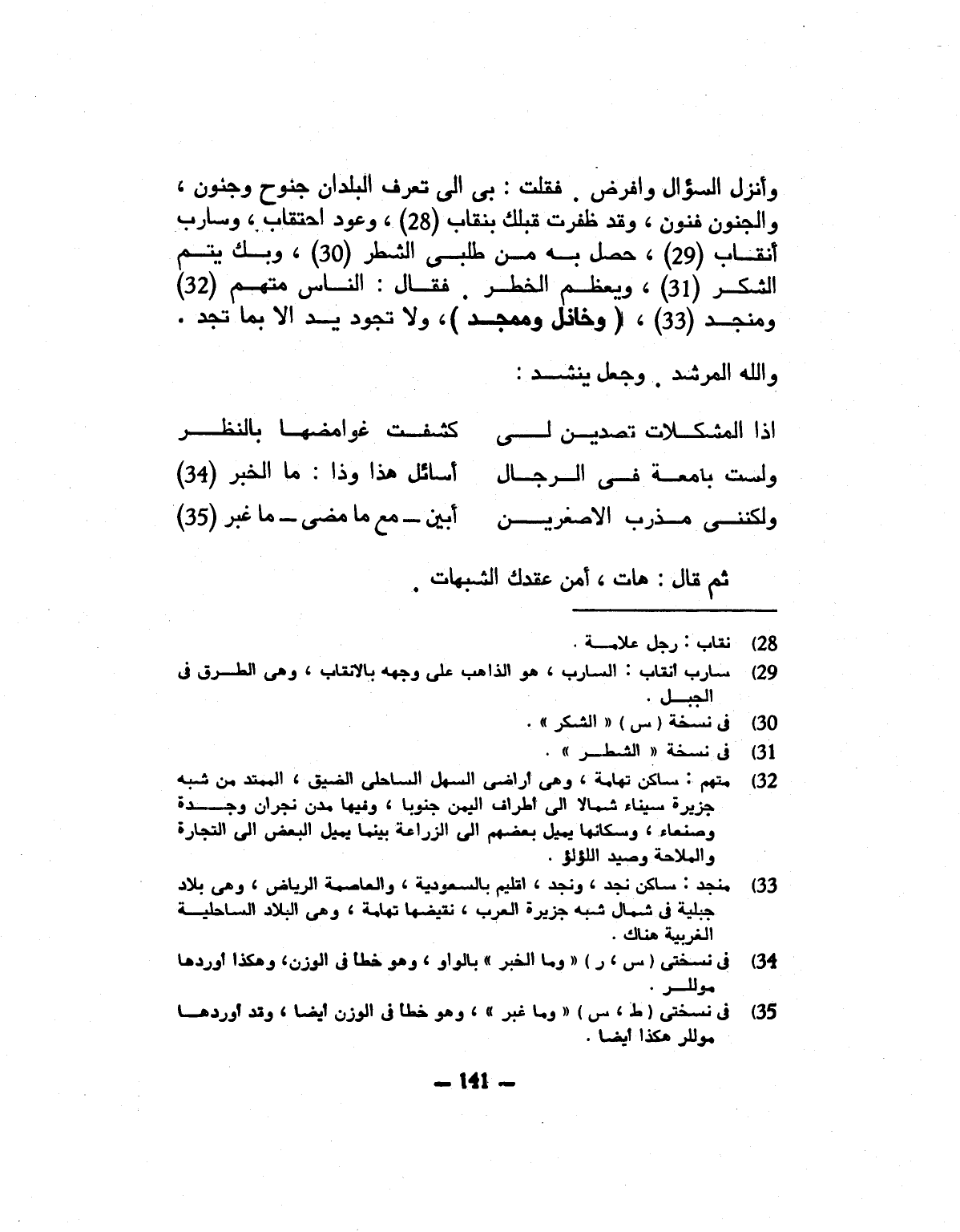 وأنزل السؤال وافرض. فقلت: بى الى تعرف البلدان جنوح وجنون، والجنون فنون، وقد ظفرت قبلك بنقاب «28» ، وعود احتقاب، وسارب أنقاب «29» ، حصل به من طلبى الشطر «30» ، وبك يتم الشكر «31» ، ويعظم الخطر. فقال: الناس متهم «32» ومنجد «33» ، (وخانل وممجد) ، ولا تجود يد الا بما تجد.