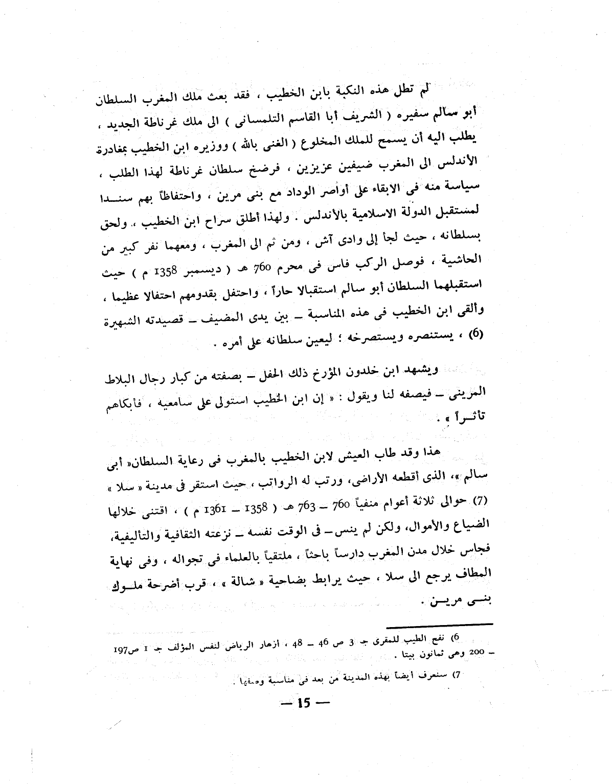 هذا وقد طاب العيش لابن الخطيب بالمغرب فى رعاية السلطان «أبى سالم» ، الذي أقطعه الأراضى، ورتب له الرواتب، حيث استقر فى مدينة «سلا» «7» حوالى ثلاثة أعوام منفيا 760- 763 هـ (1358- 1361 م) ، اقتنى خلالها الضياع والأموال، ولكن لم ينس- فى الوقت نفسه- نزعته الثقافية والتأليفية، فجاس خلال مدن المغرب دارسا باحثا، ملتقيا بالعلماء فى تجواله، وفى نهاية المطاف يرجع الى سلا، حيث يرابط بضاحية «شالة» ، قرب أضرحة ملوك بنى مرين.
