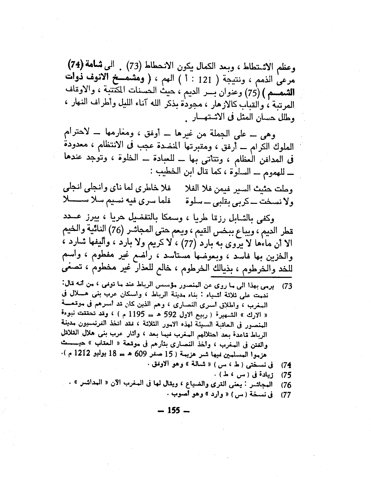 وعظم الاشتطاط، وبعد الكمال يكون الانحطاط «73» . الى شامة «74» مرعى الذمم، ونتيجة (121: أ) الهم، (ومشمخ الانوف ذوات الشمم) «75» وعنوان بر الديم، حيث الحسنات المكتتبة، والاوقاف المرتبة، والقباب كالازهار، مجودة بذكر الله آناء الليل وأطراف النهار، وطلل حسان المثل فى الاشتهار.