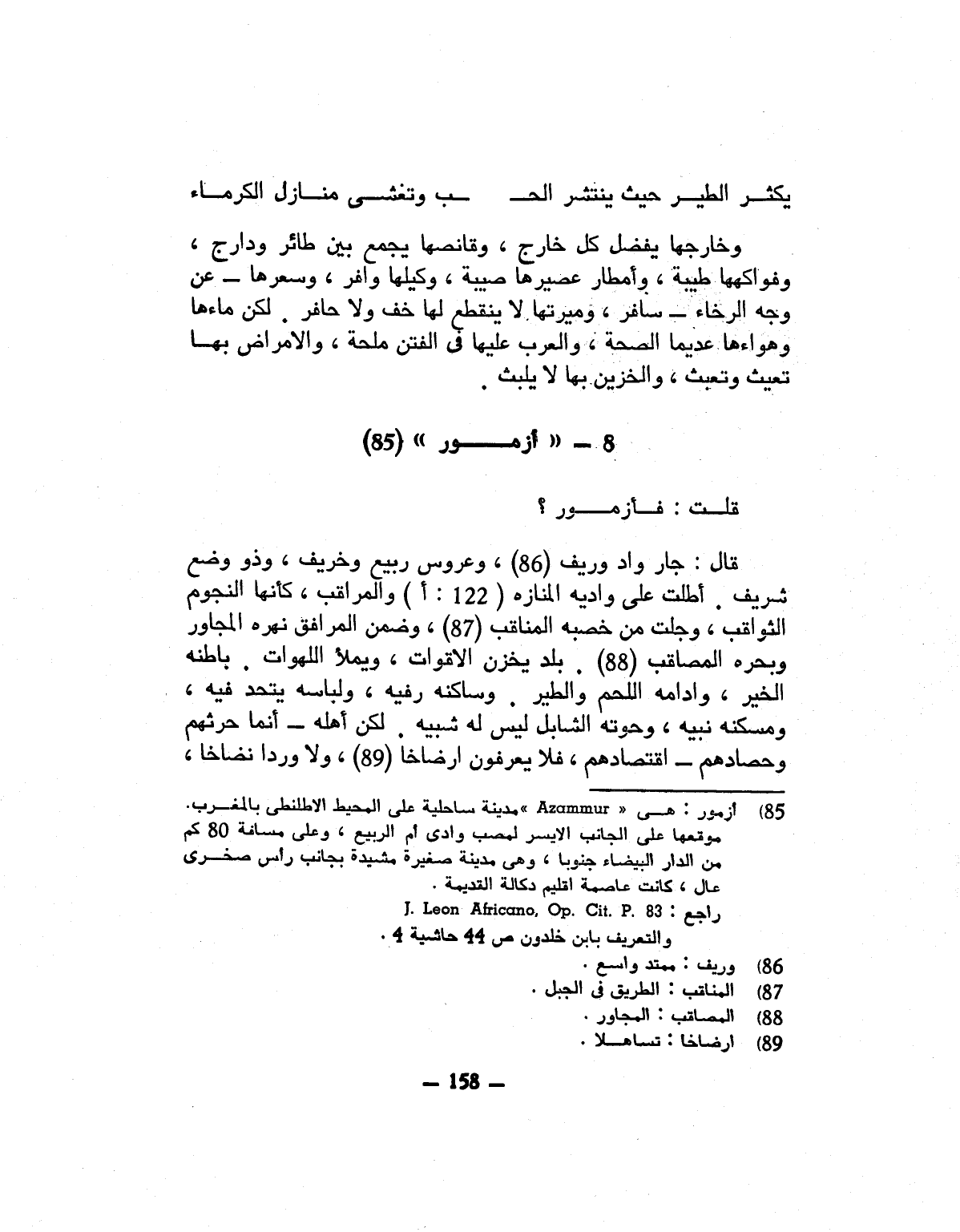 قال: جار واد وريف «86» ، وعروس ربيع وخريف، وذو وضع شريف. أطلت على واديه المنازه (122: أ) والمراقب، كأنها النجوم الثواقب، وجلت من خصبه المناقب «87» ، وضمن المرافق نهره المجاور وبحره المصاقب «88» . بلد يخزن الاقوات، ويملأ اللهوات. باطنه الخير، وادامه اللحم والطير. وساكنه رفيه، ولباسه يتحد فيه، ومسكنه نبيه، وحوته الشابل ليس له شبيه. لكن أهله- أنما حرثهم وحصادهم- اقتصادهم، فلا يعرفون ارضاخا «89» ، ولا وردا نضاخا،