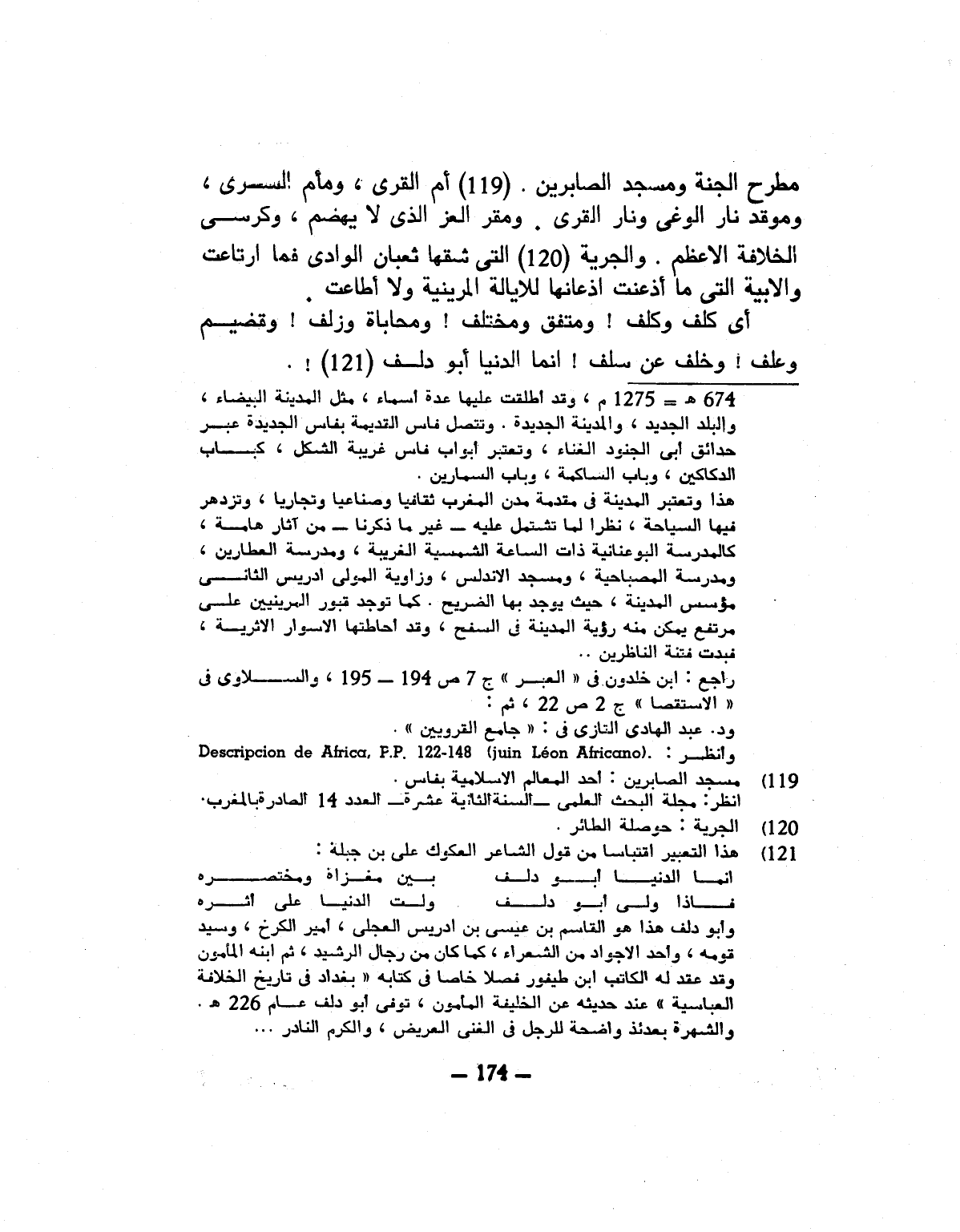 مطرح الجنة ومسجد الصابرين. «119» أم القرى، ومأم السسرى، وموقد نار الوغى ونار القرى. ومقر العز الذي لا يهضم، وكرسى الخلافة الاعظم. والجرية «120» التى شقها ثعبان الوادى فما ارتاعت والابية التى ما أذعنت اذعانها للايالة المرينية ولا أطاعت.