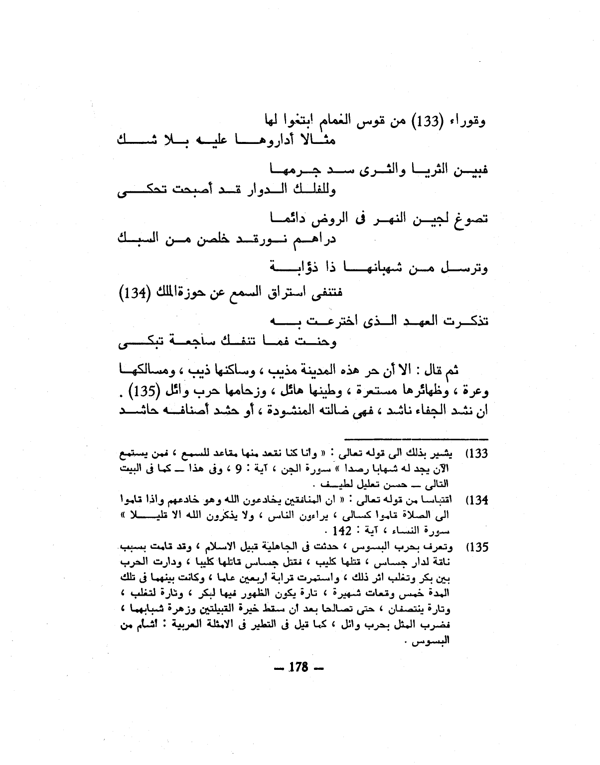 ثم قال: الا أن حر هذه المدينة مذيب، وساكنها ذيب، ومسالكها وعرة، وظهائرها مستعرة، وطينها هائل، وزحامها حرب وائل «135» .