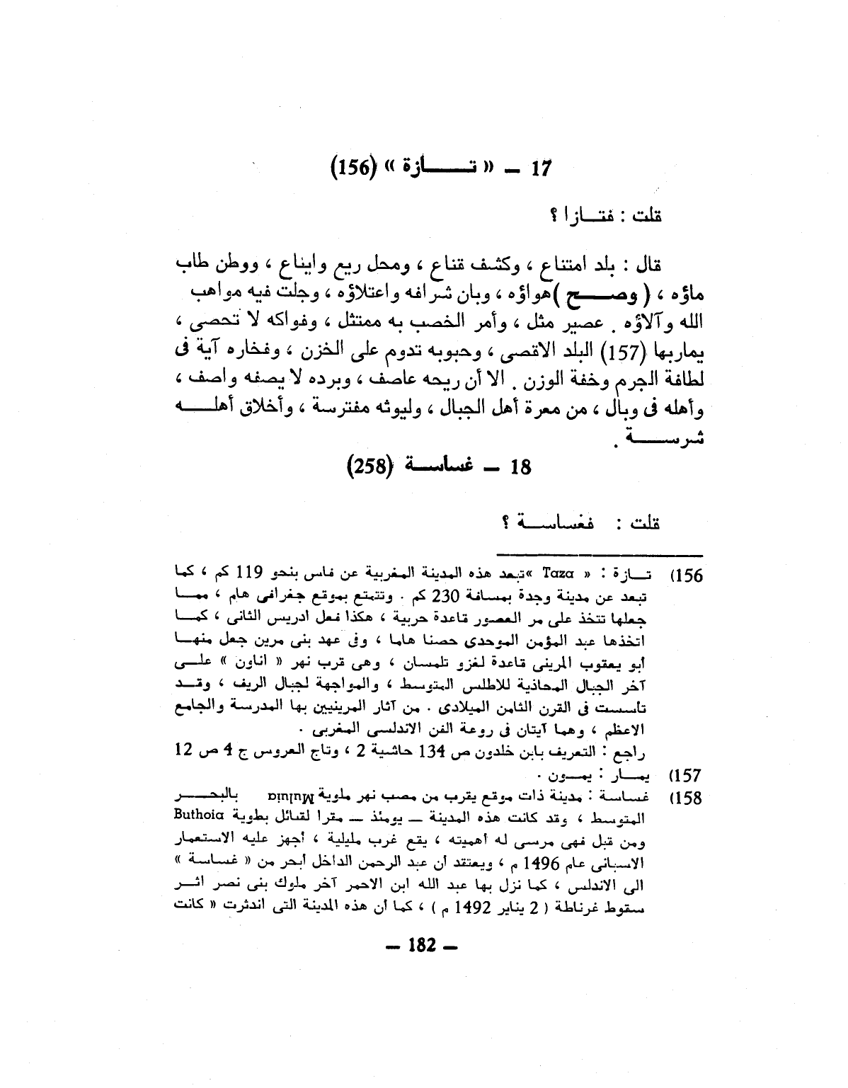 قال: بلد امتناع، وكشف قناع، ومحل ريع وايناع، ووطن طاب ماؤه، (وصح) هواؤه، وبان شرافه واعتلاؤه، وجلت فيه مواهب الله وآلاؤه. عصير مثل، وأمر الخصب به ممتثل، وفواكه لا تحصى، يماربها «157» البلد الاقصى، وحبوبه تدوم على الخزن، وفخاره آية فى لطافة الجرم وخفة الوزن. الا أن ريحه عاصف، وبرده لا يصفه واصف، وأهله فى وبال، من معرة أهل الجبال، وليوثه مفترسة، وأخلاق أهله شرسة.
