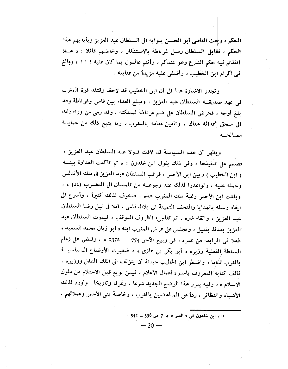 ويظهر أن هذه السياسة قد لاقت قبولا عند السلطان عبد العزيز، فصمم على تنفيذها، وفى ذلك يقول ابن خلدون: «ثم تأكدت العداوة بينه (ابن الخطيب) وبين ابن الأحمر، فرغب السلطان عبد العزيز فى ملك الأندلس وحمله عليه، وتواعدوا لذلك عند رجوعه من تلمسان الى المغرب «11» » ، وبلغت ابن الأحمر رغبة ملك المغرب هذه، فتخوف لذلك كثيرا، وأسرع الى ايفاد رسله بالهدايا والتحف الثمينة الى بلاط فاس، آملا فى نيل رضا السلطان عبد العزيز، واتقاء شره. ثم تفاجئ الظروف الموقف، فيموت السلطان عبد العزيز بعدئذ بقليل، ويجلس على عرش المغرب ابنه «أبو زيان محمد السعيد» طفلا فى الرابعة من عمره، فى ربيع الآخر 774- 1372 م، وقبض على زمام السلطة الفعلية وزيره «أبو بكر بن غازى» ، فتغيرت الأوضاع السياسية بالمغرب تماما، واضطر ابن الخطيب حينئذ أن يتزلف الى الملك الطفل ووزيره، فألف كتابه المعروف باسم «أعمال الأعلام، فيمن بويع قبل الاحتلام من ملوك الاسلام» ، وفيه يبرر هذا الوضع الجديد شرعا، وعرفا وتاريخا، وأورد لذلك الأشباه والنظائر، ردا على المناهضين بالمغرب، وخاصة بنى الأحمر وعملائهم.