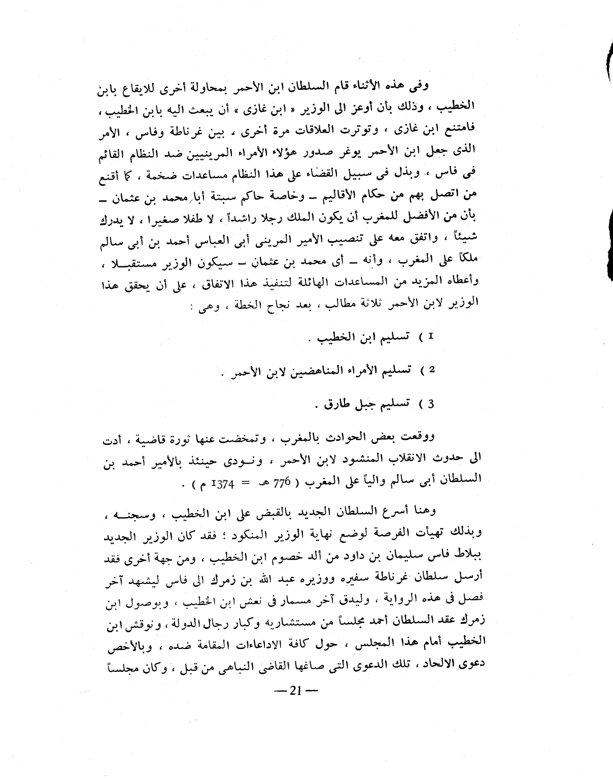 وهنا أسرع السلطان الجديد بالقبض على ابن الخطيب، وسجنه، وبذلك تهيأت الفرصة لوضع نهاية الوزير المنكود؛ فقد كان الوزير الجديد ببلاط فاس سليمان بن داود من ألد خصوم ابن الخطيب، ومن جهة أخرى فقد أرسل سلطان غرناطة سفيره ووزيره عبد الله بن زمرك الى فاس ليشهد آخر فصل فى هذه الرواية، وليدق آخر مسمار فى نعش ابن الخطيب، وبوصول ابن زمرك عقد السلطان أحمد مجلسا من مستشاريه وكبار رجال الدولة، ونوقش ابن الخطيب أمام هذا المجلس، حول كافة الادعاءات المقامة ضده، وبالأخص دعوى الالحاد، تلك الدعوى التى صاغها القاضى النباهى من قبل، وكان مجلسا