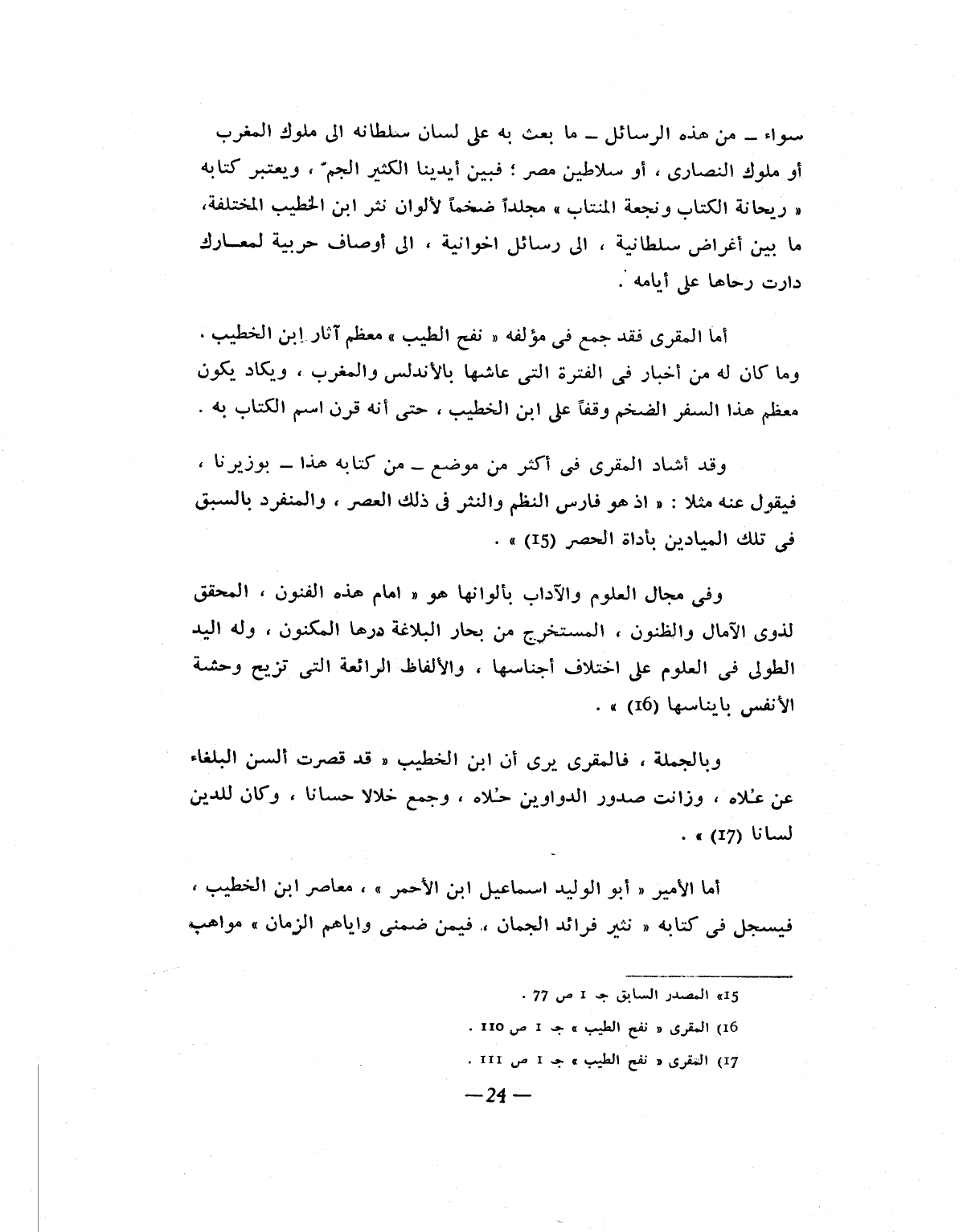 وقد أشاد المقرى فى أكثر من موضع- من كتابه هذا- بوزيرنا، فيقول عنه مثلا: «اذ هو فارس النظم والنثر فى ذلك العصر، والمنفرد بالسبق فى تلك الميادين بأداة الحصر «15» » .