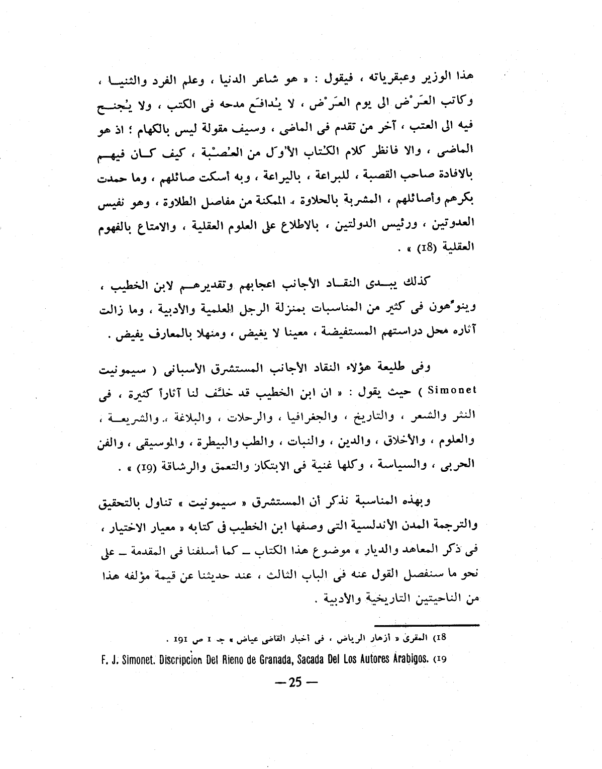 وبهذه المناسبة نذكر أن المستشرق «سيمونيت» تناول بالتحقيق والترجمة المدن الأندلسية التى وصفها ابن الخطيب فى كتابه «معيار الاختيار، فى ذكر المعاهد والديار» موضوع هذا الكتاب- كما أسلفنا فى المقدمة- على نحو ما سنفصل القول عنه فى الباب الثالث، عند حديثنا عن قيمة مؤلفه هذا من الناحيتين التاريخية والأدبية.