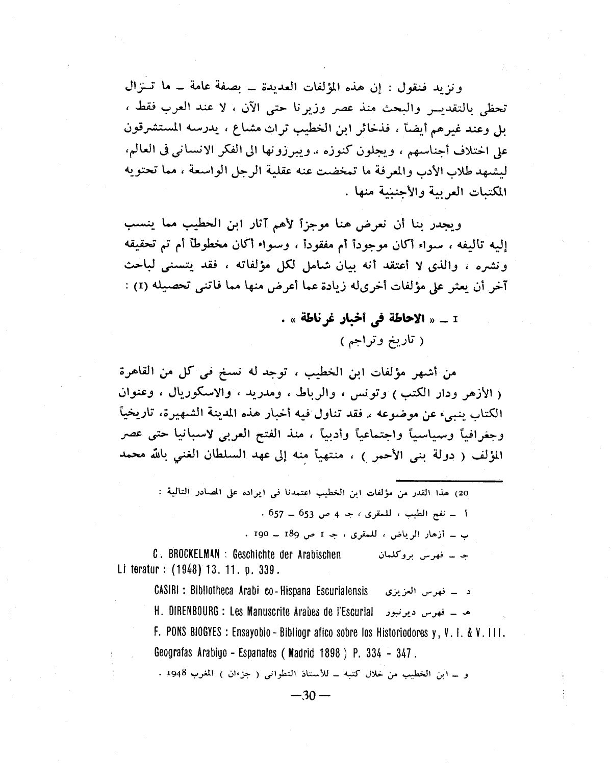 ونزيد فنقول: إن هذه المؤلفات العديدة- بصفة عامة- ما تزال تحظى بالتقدير والبحث منذ عصر وزيرنا حتى الآن، لا عند العرب فقط، بل وعند غيرهم أيضا، فذخائر ابن الخطيب تراث مشاع، يدرسه المستشرقون على اختلاف أجناسهم، ويجلون كنوزه، ويبرزونها الى الفكر الانسانى فى العالم، ليشهد طلاب الأدب والمعرفة ما تمخضت عنه عقلية الرجل الواسعة، مما تحتويه المكتبات العربية والأجنبية منها.