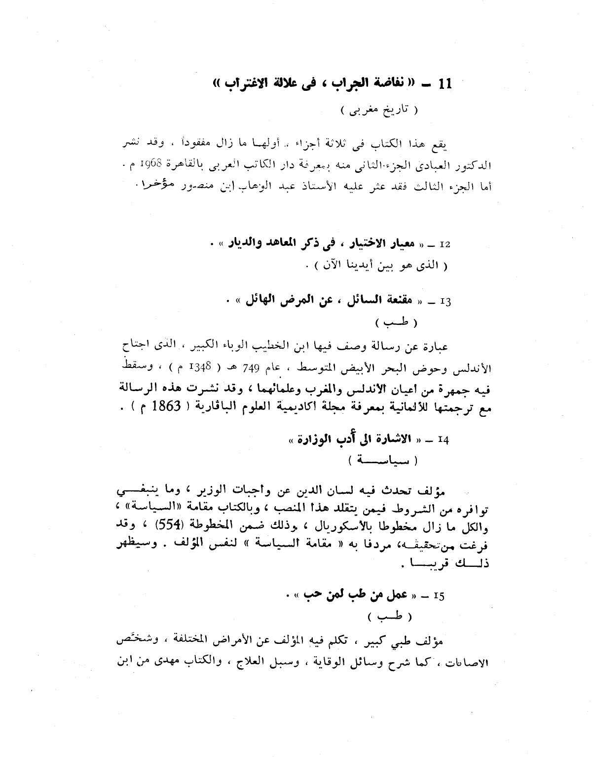 مؤلف تحدث فيه لسان الدين عن واجبات الوزير، وما ينبغي توافره من الشروط فيمن يتقلد هذا المنصب، وبالكتاب مقامة «السياسة» ، والكل ما زال مخطوطا بالإسكوريال، وذلك ضمن المخطوطة (554) ، وقد فرغت من تحقيقه، مردفا به «مقامة السياسة» لنفس المؤلف. وسيظهر ذلك قريبا.
