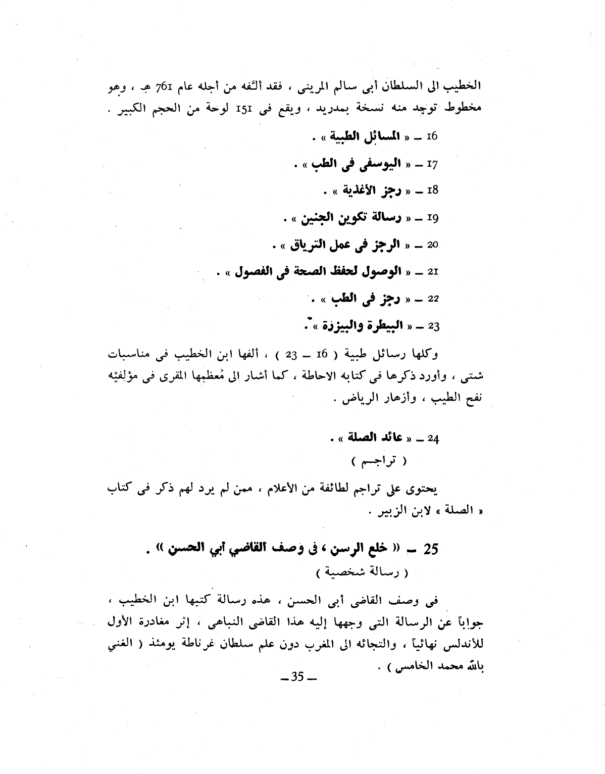 . وكلها رسائل طبية (16- 23) ، ألفها ابن الخطيب فى مناسبات شتى، وأورد ذكرها فى كتابه الاحاطة، كما أشار الى معظمها المقرى فى مؤلفيه نفح الطيب، وأزهار الرياض.