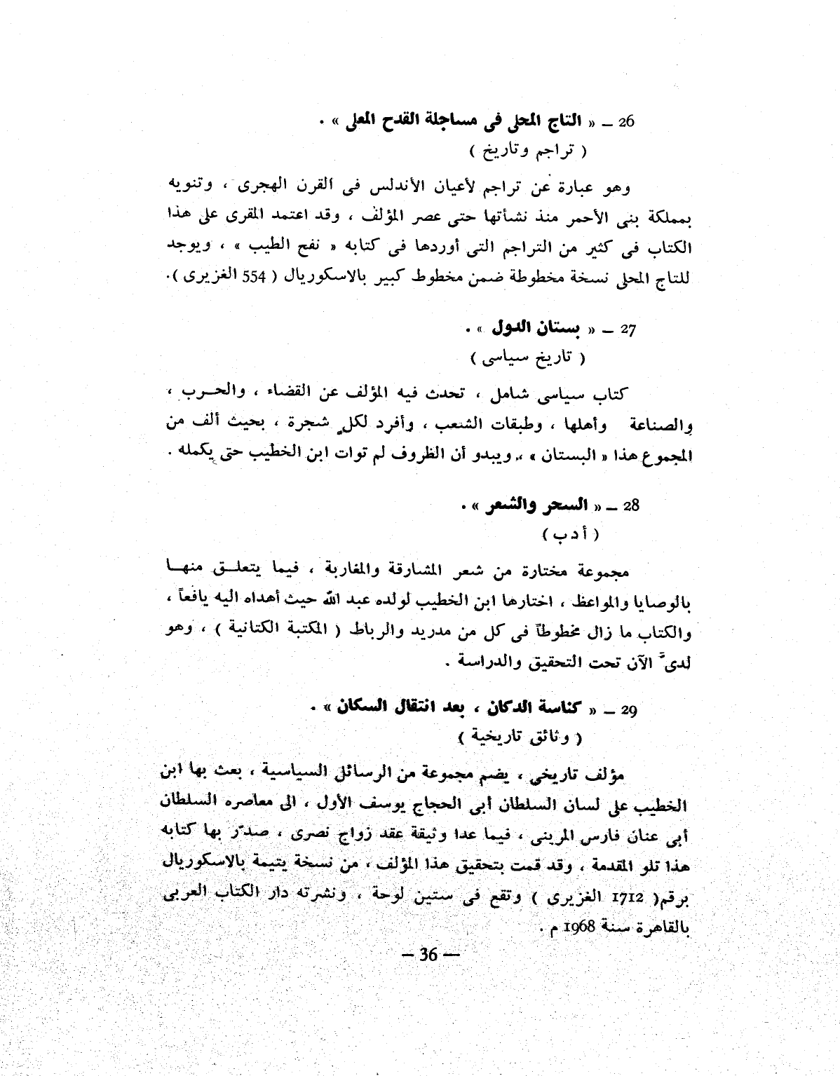 مؤلف تاريخى، يضم مجموعة من الرسائل السياسية، بعث بها ابن الخطيب على لسان السلطان أبى الحجاج يوسف الأول، الى معاصره السلطان أبى عنان فارس المرينى، فيما عدا وثيقة عقد زواج نصرى، صدّر بها كتابه هذا تلو المقدمة، وقد قمت بتحقيق هذا المؤلف، من نسخة يتيمة بالاسكوريال برقم (1712 الغزيرى) وتقع فى ستين لوحة، ونشرته دار الكتاب العربى بالقاهرة سنة 1968 م.