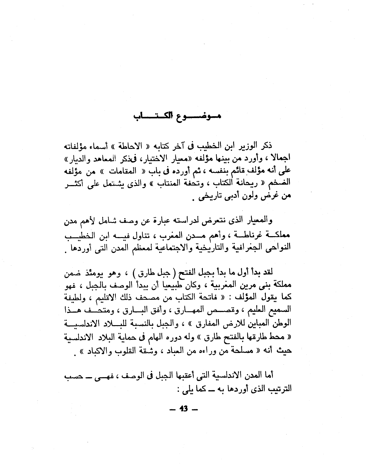 والمعيار الذي نتعرض لدراسته عبارة عن وصف شامل لأهم مدن مملكة غرناطة، وأهم مدن المغرب، تناول فيه ابن الخطيب النواحى الجغرافية والتاريخية والاجتماعية لمعظم المدن التى أوردها.
