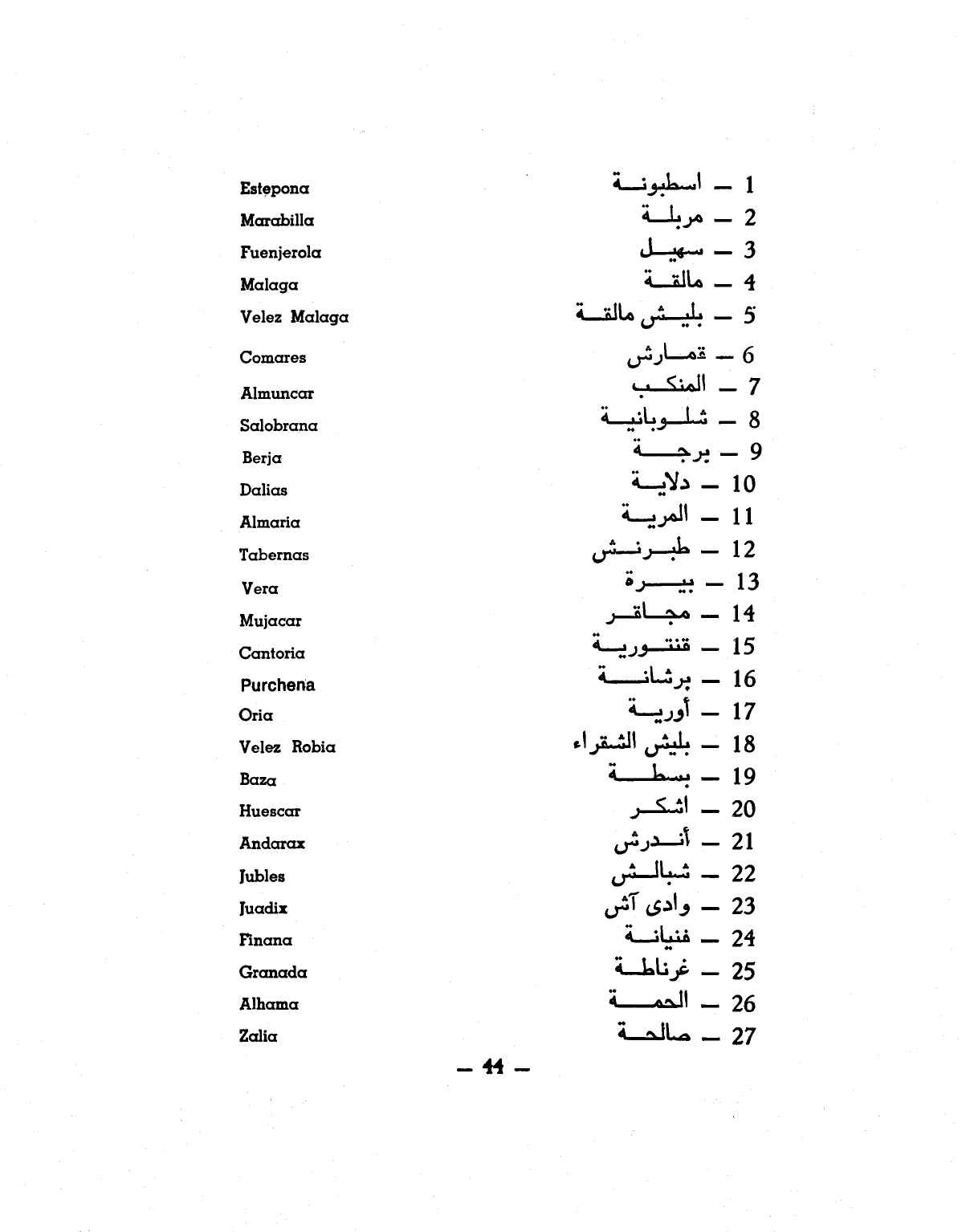 1- اسطبونة -2 Estepona مربلة -3 Marabilla سهيل -4 Fuenjerola مالقة -5 Malaga بليش مالقة -6 Velez Malaga قمارش -7 Comares المنكب -8 Almuncar شلوبانية -9 Salobrana برجة -10 Berja دلاية -11 Dalias المرية -12 Almaria طبرنش -13 Tabernas بيرة -14 Vera مجاقر -15 Mujacar قنتورية -16 Cantoria برشانة -17 Purchena أورية -18 Oria بليش الشقراء -19 Velez Robia بسطة -20 Baza أشكر -21 Huescar أندرش -22 Andarax شبالش -23 Jubles وادى آش -24 Juadix فنيانة -25 Finana غرناطة -26 Granada الحمة -27 Alhama صالحة Zalia