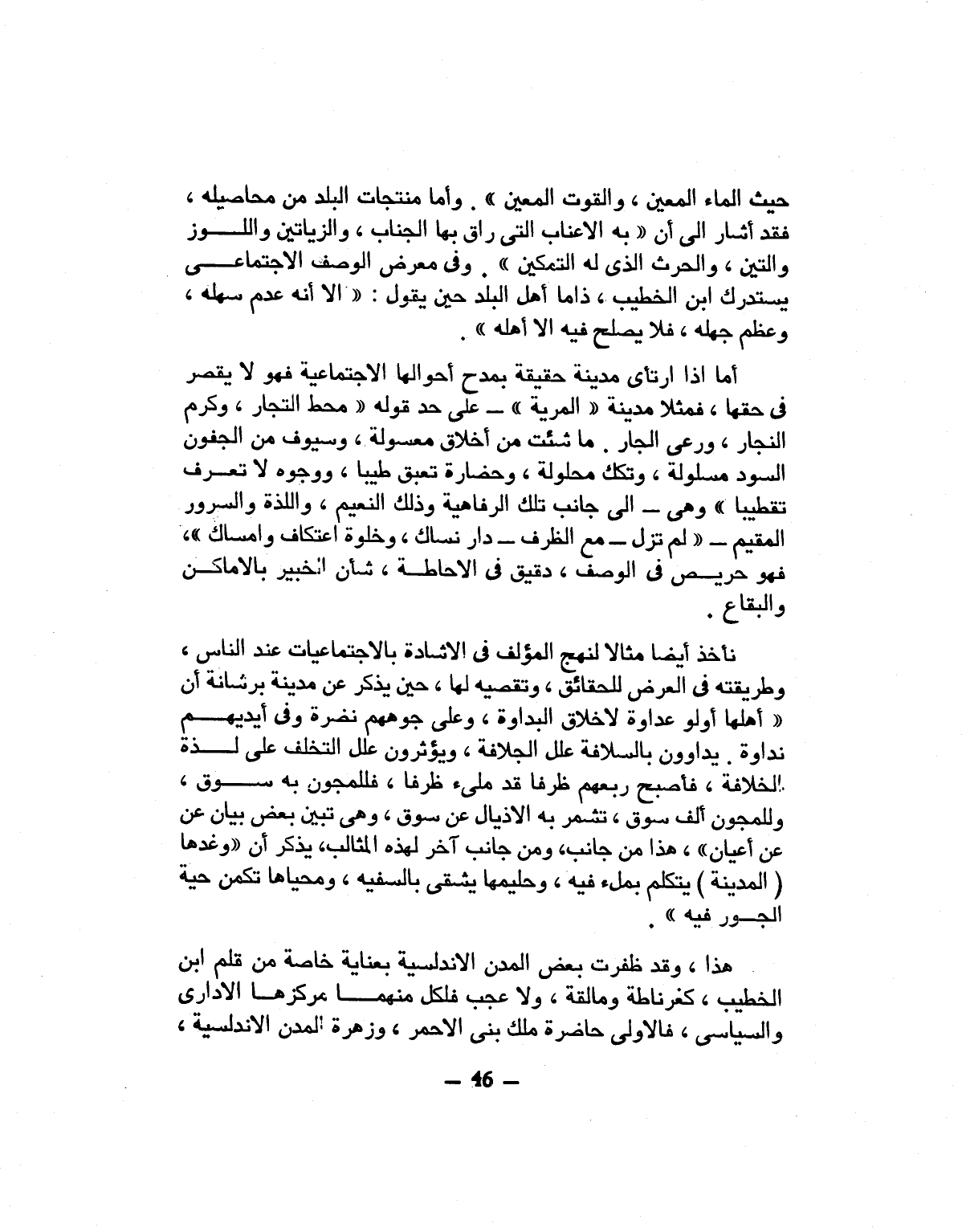 أما اذا ارتأى مدينة حقيقة بمدح أحوالها الاجتماعية فهو لا يقصر فى حقها، فمثلا مدينة «المرية» - على حد قوله «محط التجار، وكرم النجار، ورعى الجار. ما شئت من أخلاق معسولة، وسيوف من الجفون السود مسلولة، وتكك محلولة، وحضارة تعبق طيبا، ووجوه لا تعرف تقطيبا» وهى- الى جانب تلك الرفاهية وذلك النعيم، واللذة والسرور المقيم- «لم تزل- مع الظرف- دار نساك، وخلوة اعتكاف وامساك» ، فهو حريص فى الوصف، دقيق فى الاحاطة، شأن الخبير بالاماكن والبقاع.