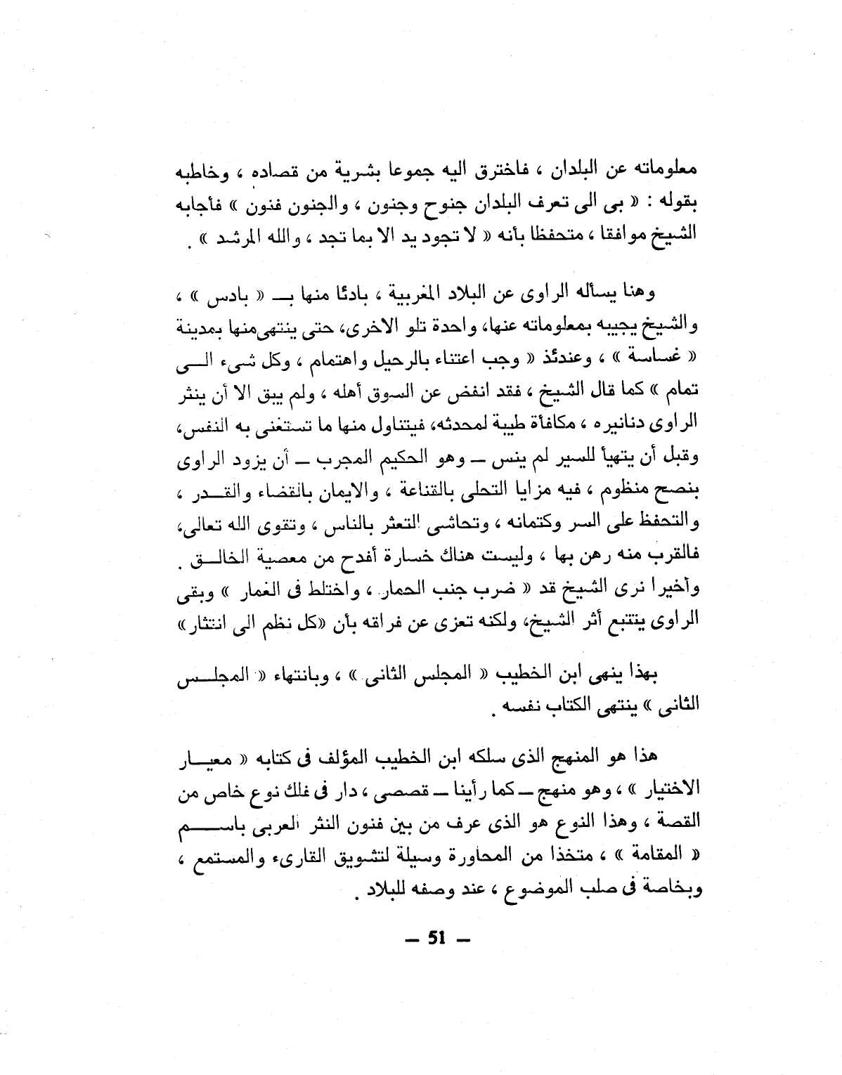 هذا هو المنهج الذي سلكه ابن الخطيب المؤلف فى كتابه «معيار الاختيار» ، وهو منهج- كما رأينا- قصصى، دار فى فلك نوع خاص من القصة، وهذا النوع هو الذي عرف من بين فنون النثر العربى باسم «المقامة» ، متخذا من المحاورة وسيلة لتشويق القارئ والمستمع، وبخاصة فى صلب الموضوع، عند وصفه للبلاد.