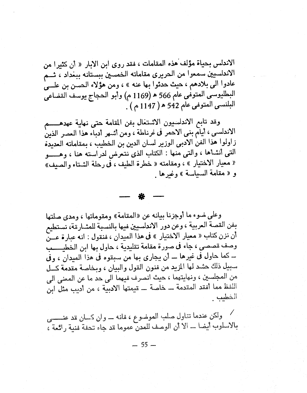 -*- وعلى ضوء ما أوجزنا بيانه عن «المقامة» ومقوماتها، ومدى صلتها بفن القصة العربية، وعن دور الاندلسيين فيها بالنسبة للمشارقة، نستطيع أن نزن كتاب «معيار الاختيار» فى هذا الميدان، فنقول: انه عبارة عن وصف قصصى، جاء فى صورة مقامة تقليدية، حاول بها ابن الخطيب- كما حاول فى غيرها- أن يجارى بها من سبقوه فى هذا الميدان، وفى سبيل ذلك حشد لها المزيد من فنون القول والبيان، وبخاصة مقدمة كل من المجلسين، ونهايتهما، حيث انصرف فيهما الى حد ما عن المعنى الى اللفظ مما أفقد المقدمة- خاصة- قيمتها الادبية، من أديب مثل ابن الخطيب.